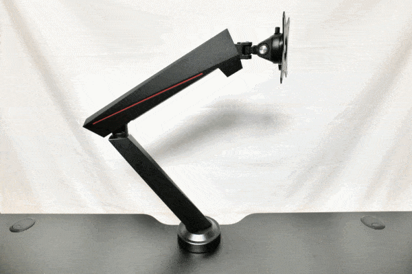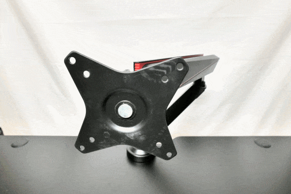 Am Ende des Auslegers befindet sich schließlich die Aufhängung für den Monitor, welche sich ihrerseits um 3 Achsen drehen lässt. Dank einer Mechanik wird beim auf- und abbewegen des Auslegers die dadurch auftretende Rotation der Monitor-Aufhängung ausgeglichen, so dass der daran angebrachte Monitor seine Ausrichtung beibehält.