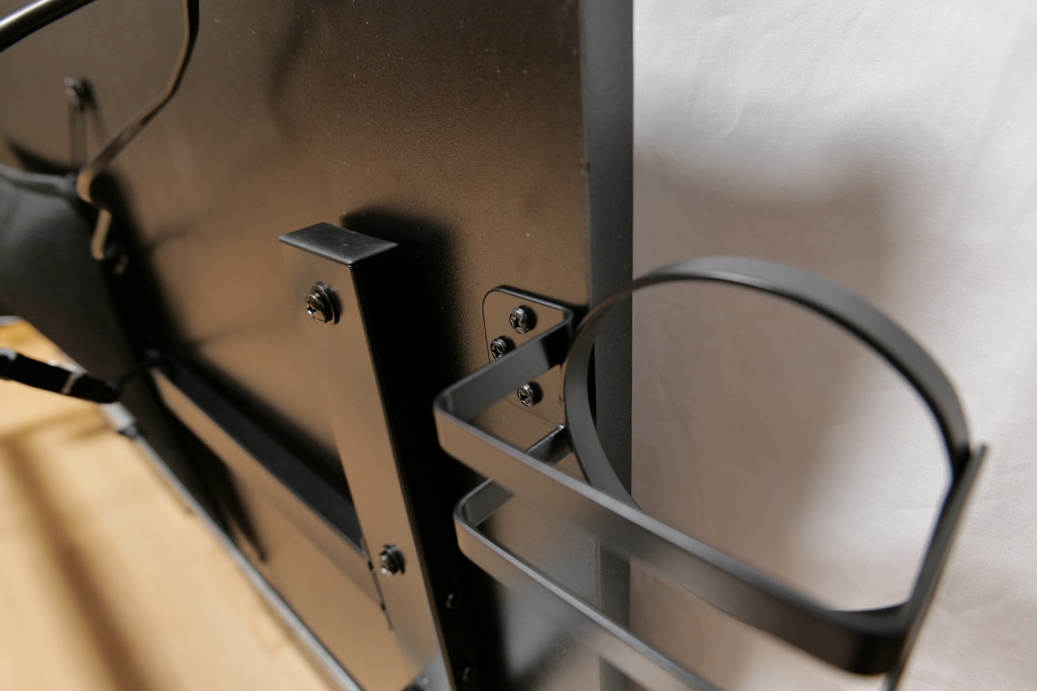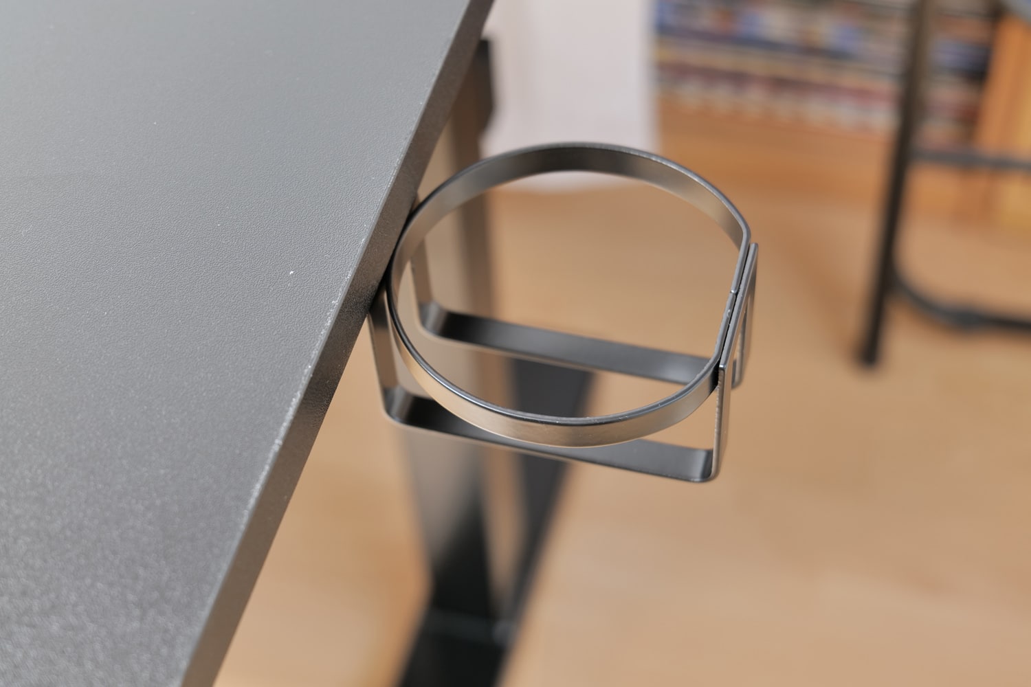 Als kleine Extras liegt dem Ganzen zwei Halterungen für Kopfhörer und Getränk bei, die unterseitig befestigt werden können. Diese schätzen wir jedoch als überwiegend nebensächlich oder sogar überflüssig ein. Lieber hätten wir uns mehr Möglichkeiten zum Kabelmanagement gewünscht.