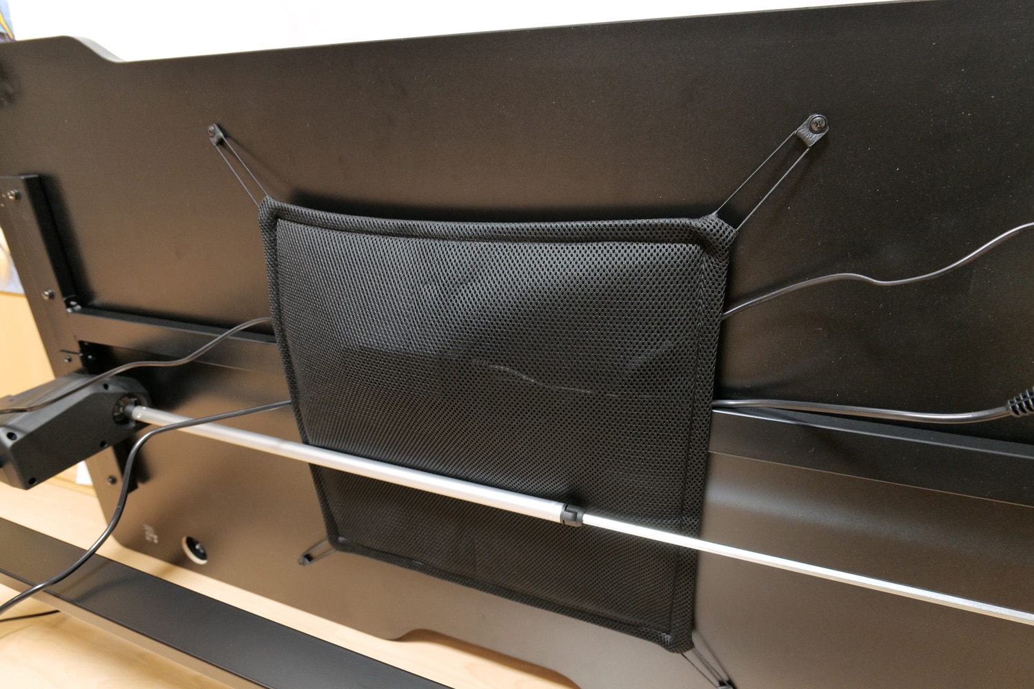 Das Kabelmanagement des DT410 ist grundsätzlich eher als rudimentär einzustufen und besteht aus zwei im hinteren Bereich der Tischplatte beidseitig befindlichen Löchern mit Kunststoffblenden und einem mittig unterhalb der Tischplatte gespannten flexiblen Nylon-Netz, mit welchem man einige Kabelstränge sortieren und verbergen kann. Einen ausgewachsenen Kabelsalat wird man hiermit jedoch nicht bewältigen können. Bereits einige simple Befestigungshilfen auf der Tischunterseite hätten hierfür Wunder gewirkt.