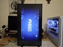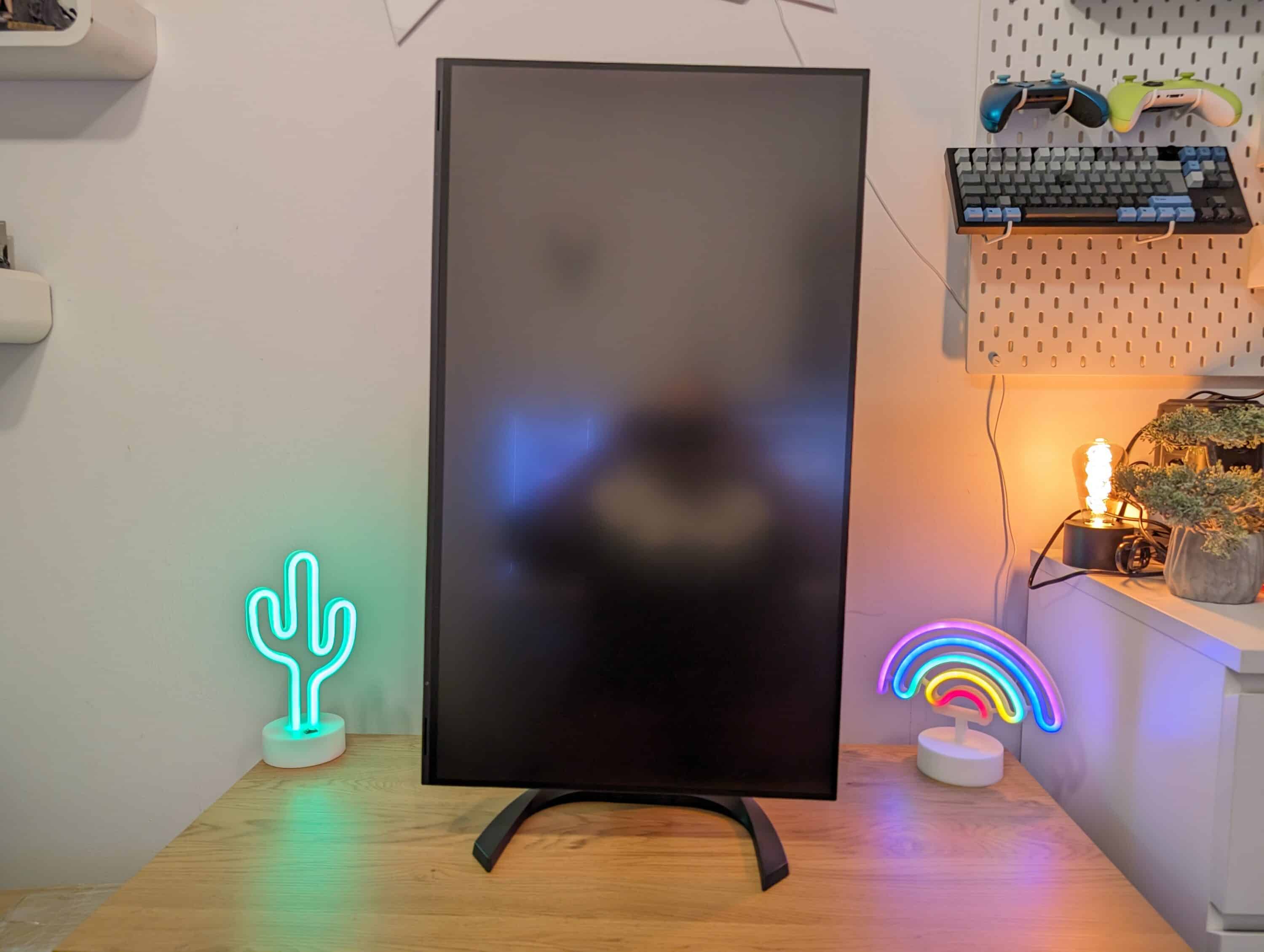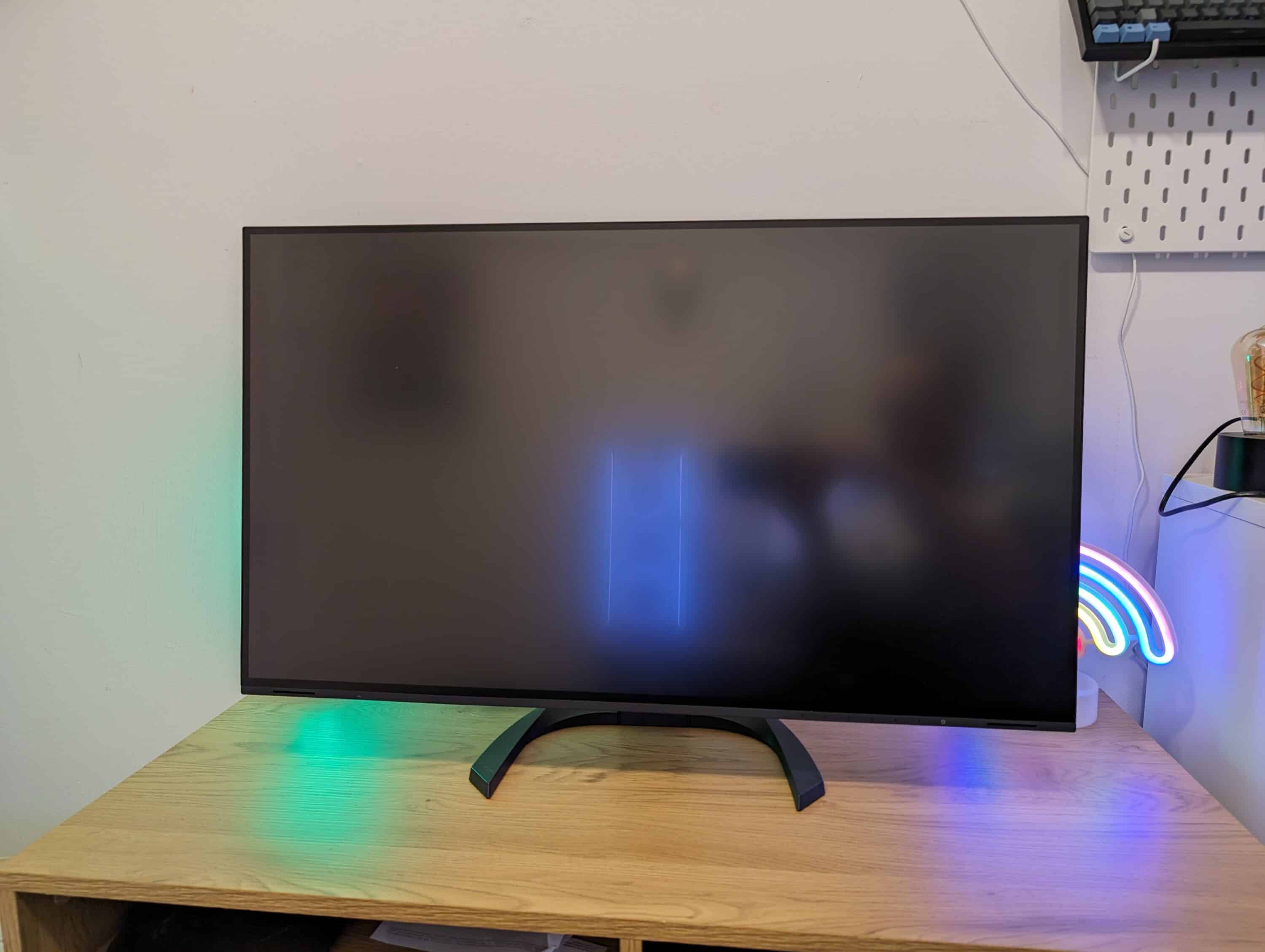 Auf wirklich auffällige Designmerkmale verzichtet der Monitor allerdings. Er kommt in schwarzer (oder auf Wunsch auch weißer) Farbe daher und sieht eben auf wie ein typischer Monitor. Vergleichsweise schmal fallen die Displayränder aus. An den Seiten und oben sind sie lediglich einen Millimeter schmal, unten hingegen rund acht mm.