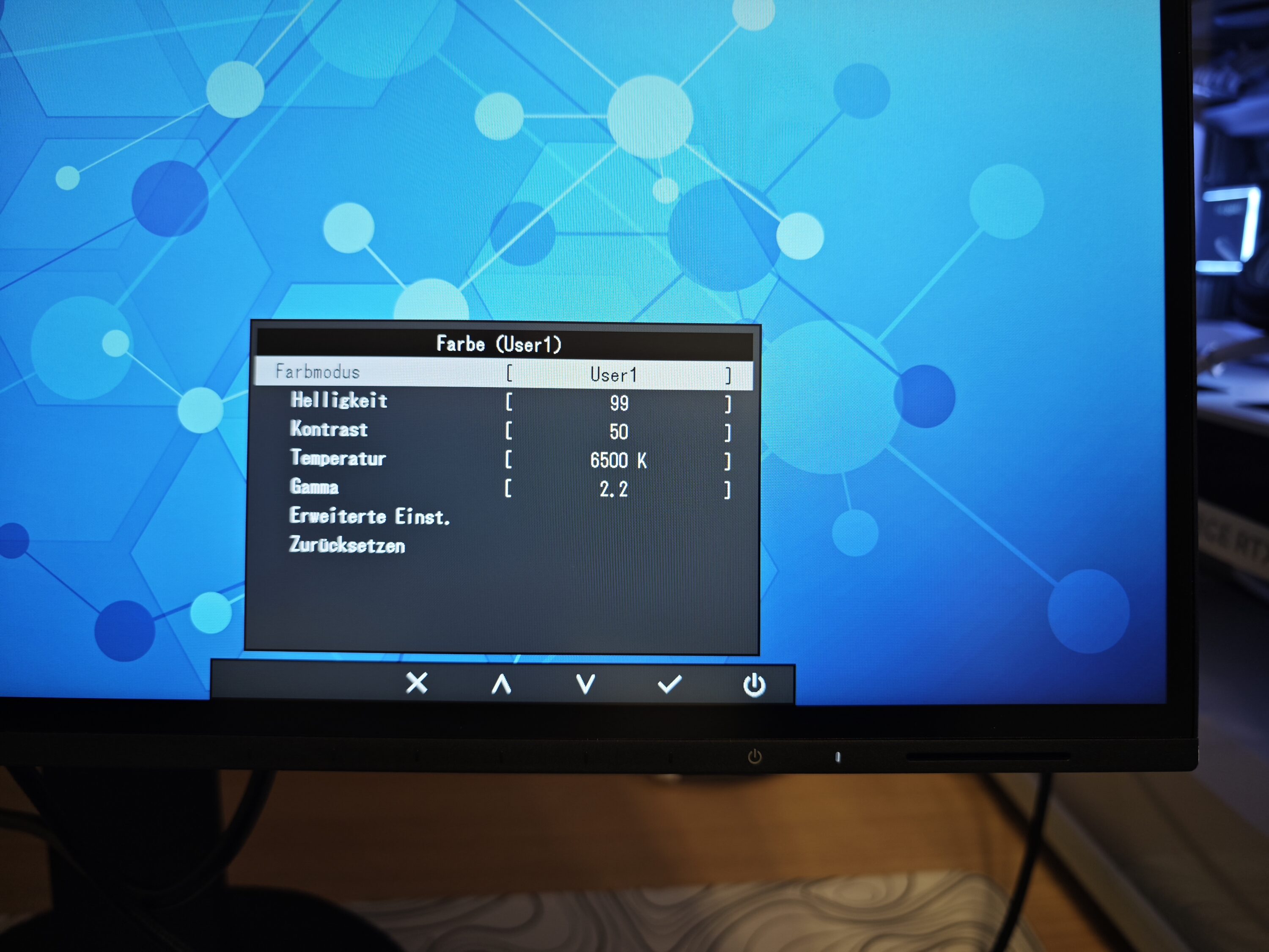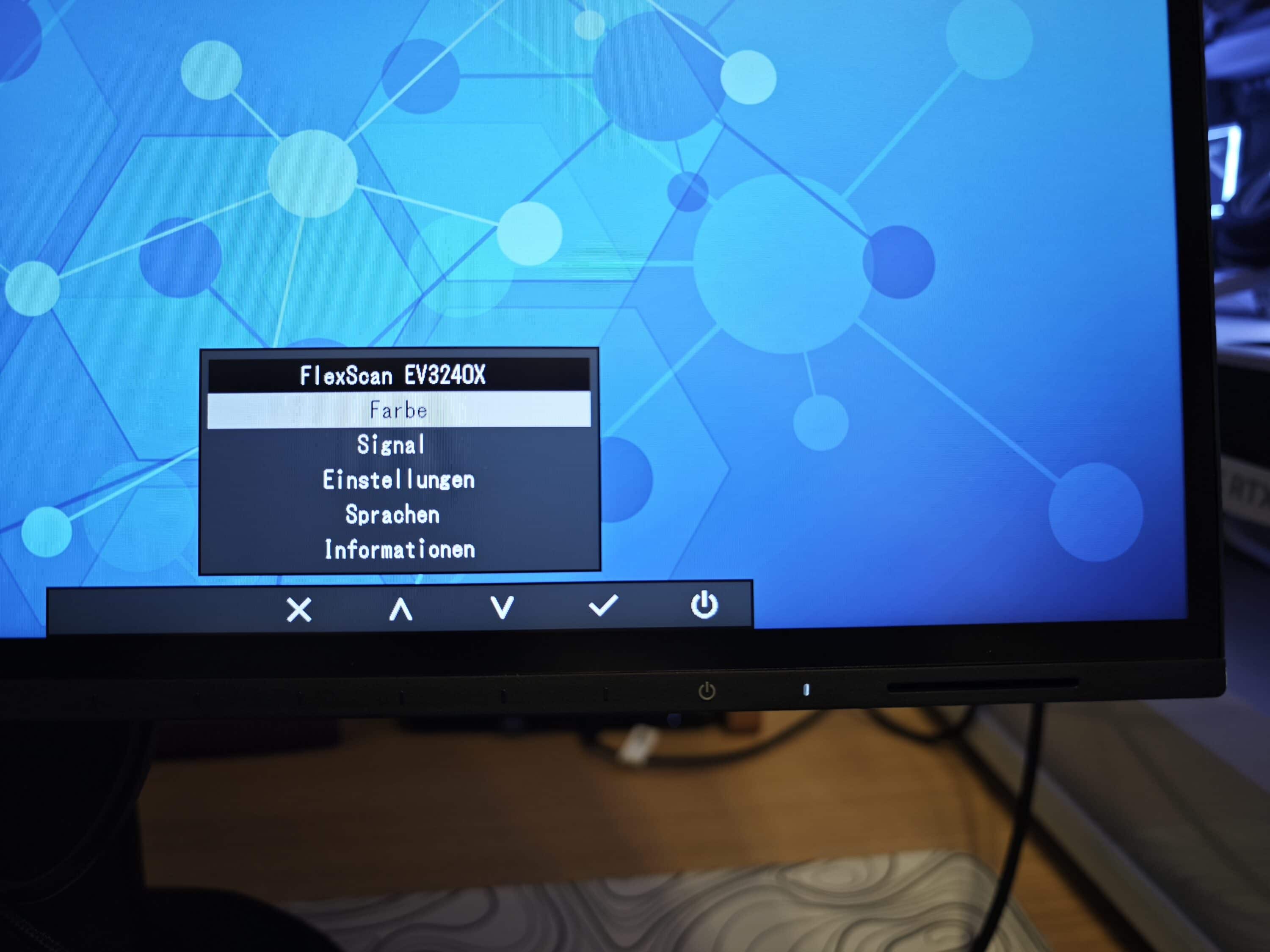 Das On-Screen Display (kurz: OSD) des EIZO FlexScan EV3240X wird über die Touch-Sensoren an der Vorderseite gesteuert. Das funktioniert auch präzise und zuverlässig. Sehr löblich finde ich, dass das OSD offen bleibt, bis ich es selbst schließe.