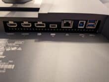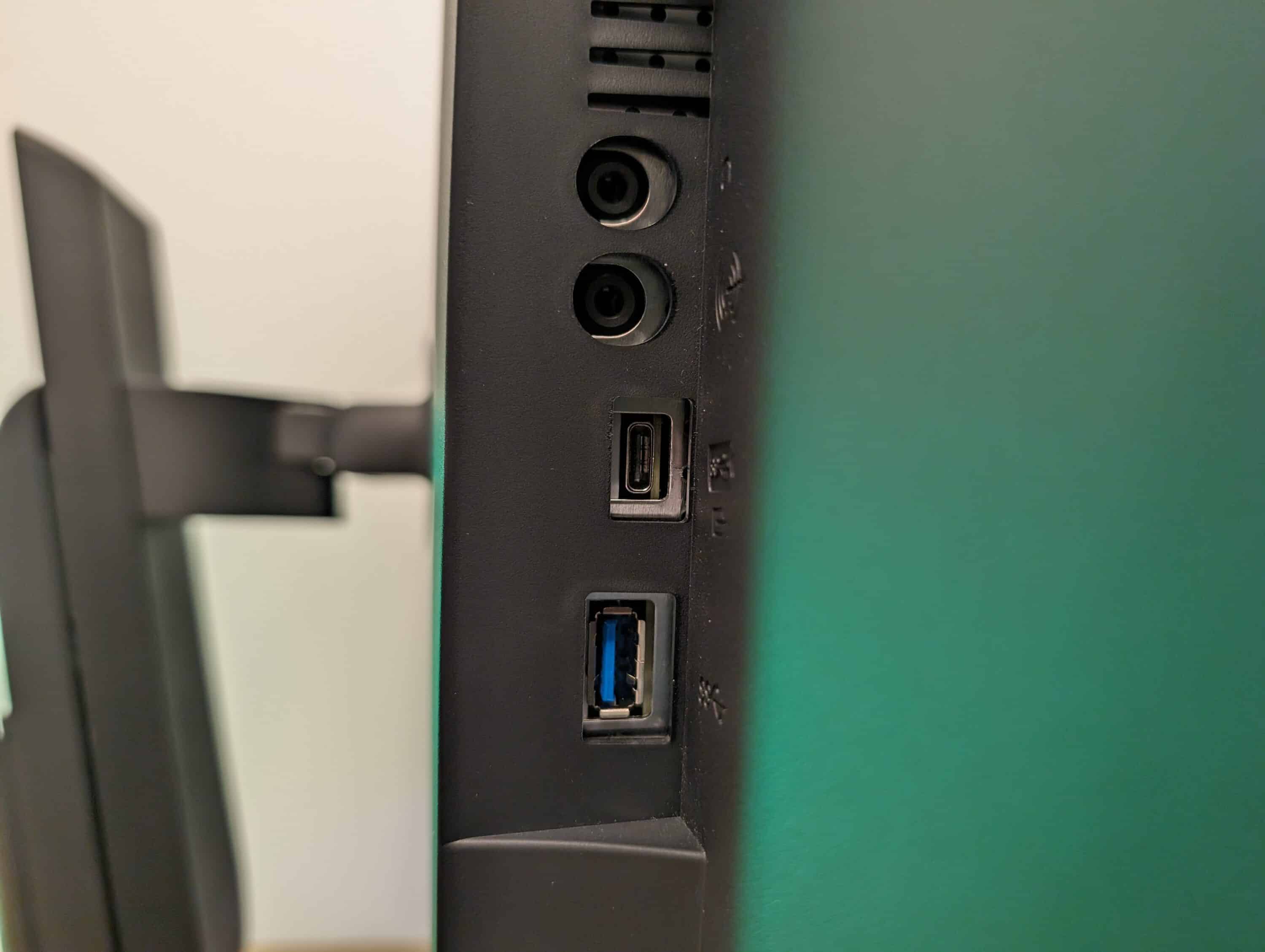 Weitere Anschlüsse verbinden sich, leicht zugänglich, an der linken Seite des Monitors. Hier kommen zwei 3,5-mm-Klinkenanschlüsse, einmal USB-C und einmal USB-A 3.0 hinzu. Der rückseitige USB-C-Port beherrscht zudem PowerDelivery mit bis zu 94 Watt, der seitliche Anschluss mit maximal 15 Watt. Beide Anschlüsse verfügen jedoch über einen DisplayPort-Alt-Modus.