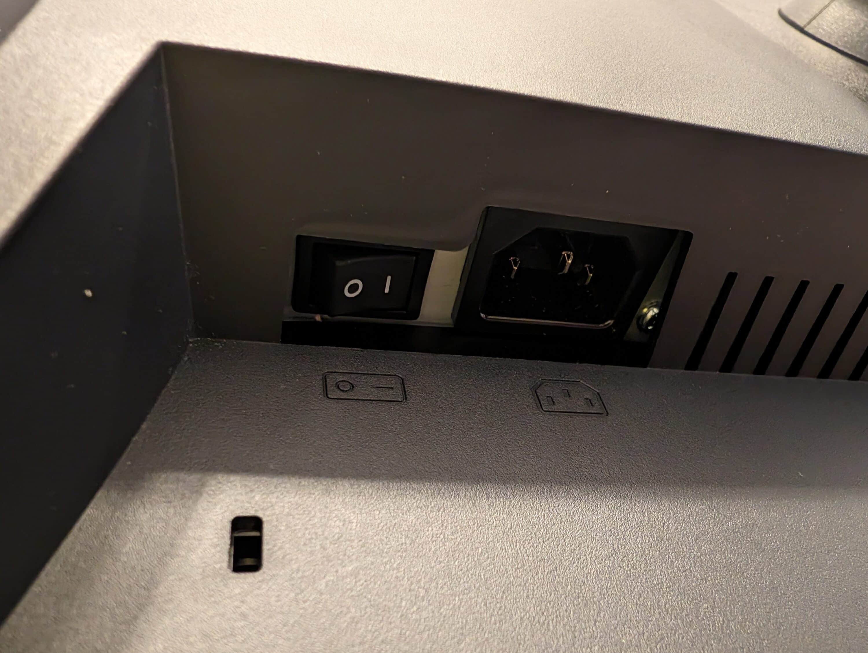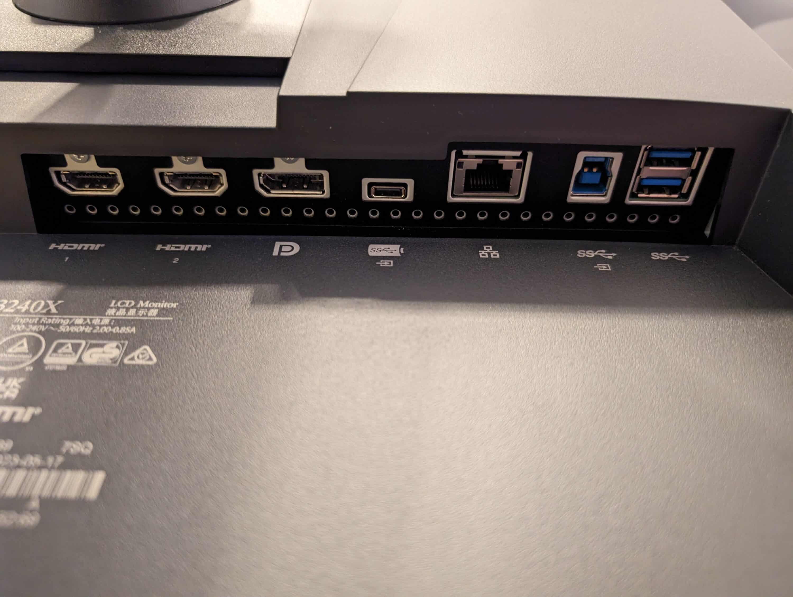 Die Anschlussvielfalt des EIZO FlexScan EV3240X gefällt. Der Hersteller teilt die Ports auf die Rückseite und die linke Seite auf, wobei hinten die meisten Anschlüsse zu finden sind. Rechts vom Standfuß finden wir den Stromanschluss samt des Netzschalters, während die Bildeingänge auf der linken Seite des Standfußes zu finden sind. Hier stehen die folgenden Ports zur Wahl:
