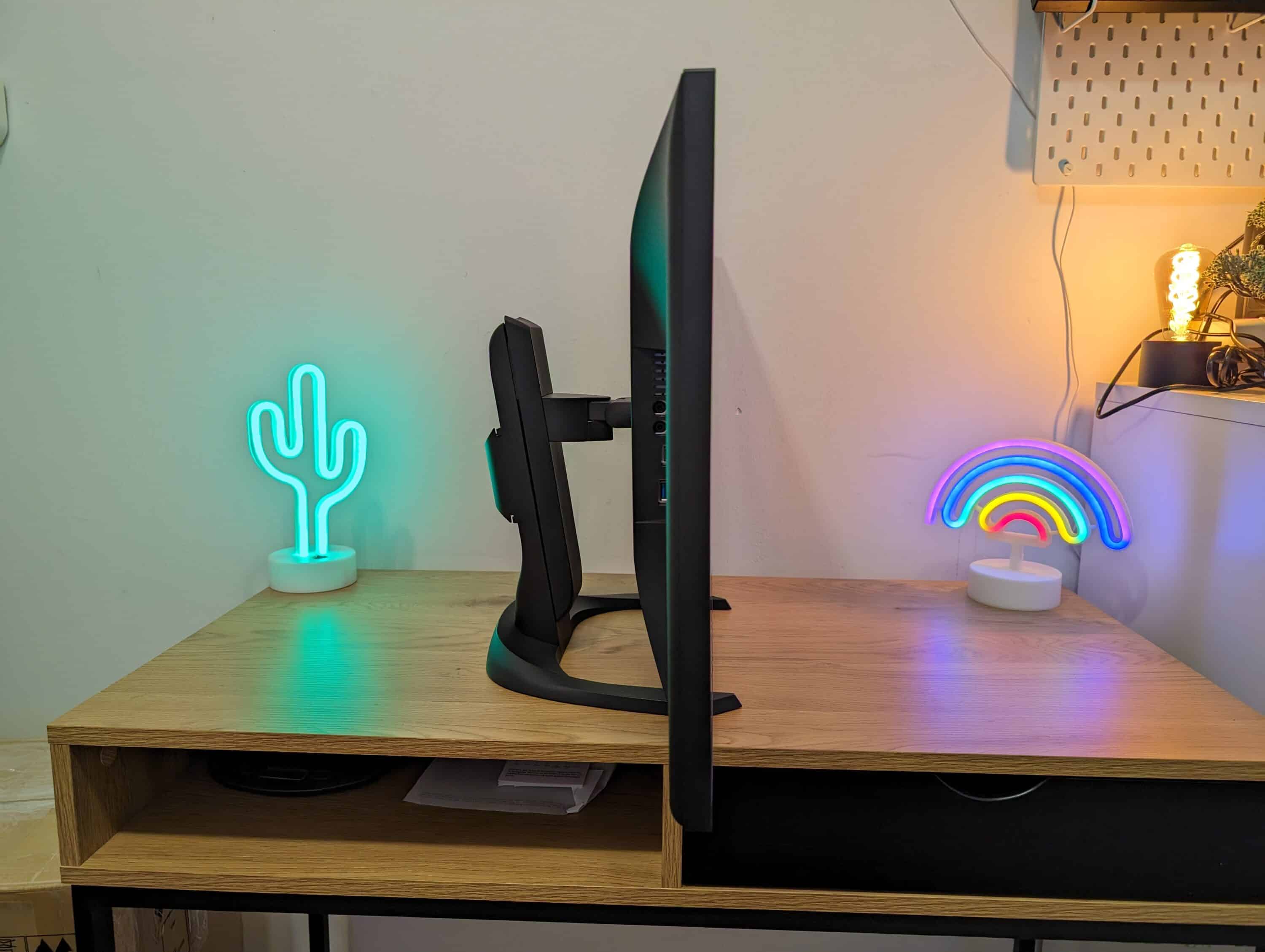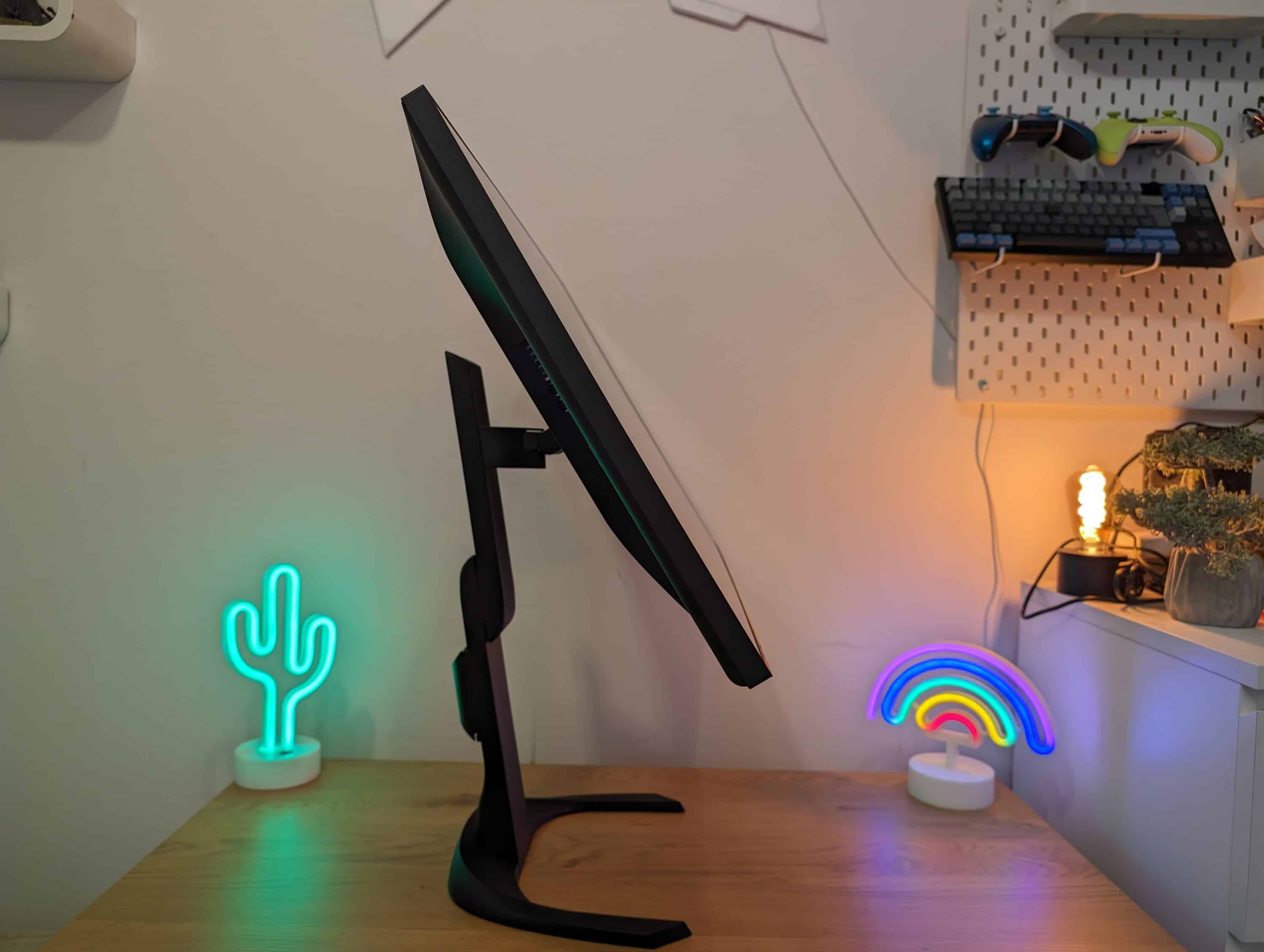 Außerdem lässt sich der Bildschirm zwischen 5° vor und 35° zurück neigen, um satte 90° nach links und rechts drehen und mittels Pivotfunktion im Uhrzeigersinn in die Vertikale verfrachten. Hier bleiben also keine Wünsche offen.