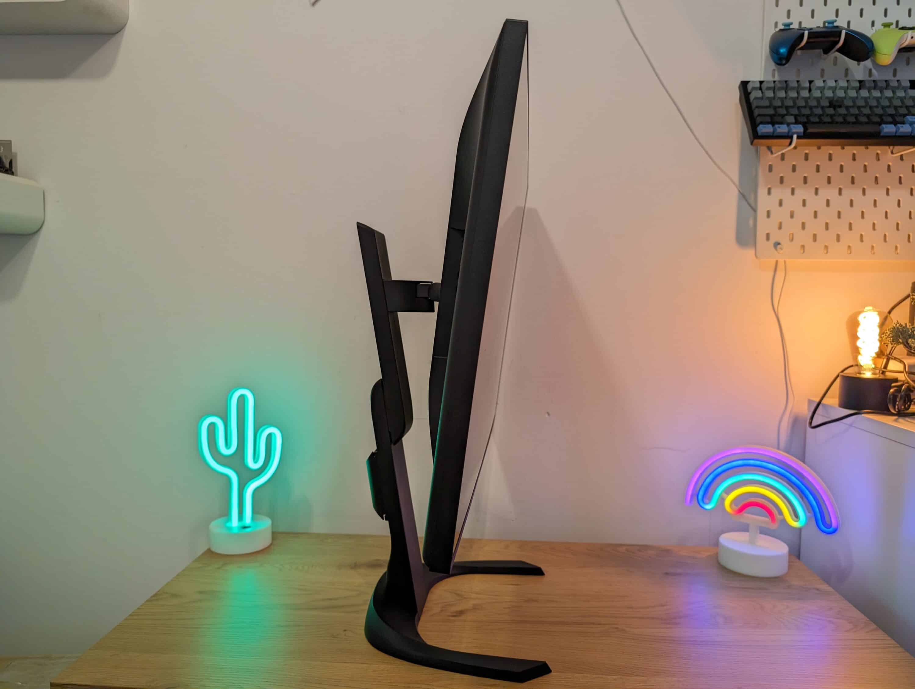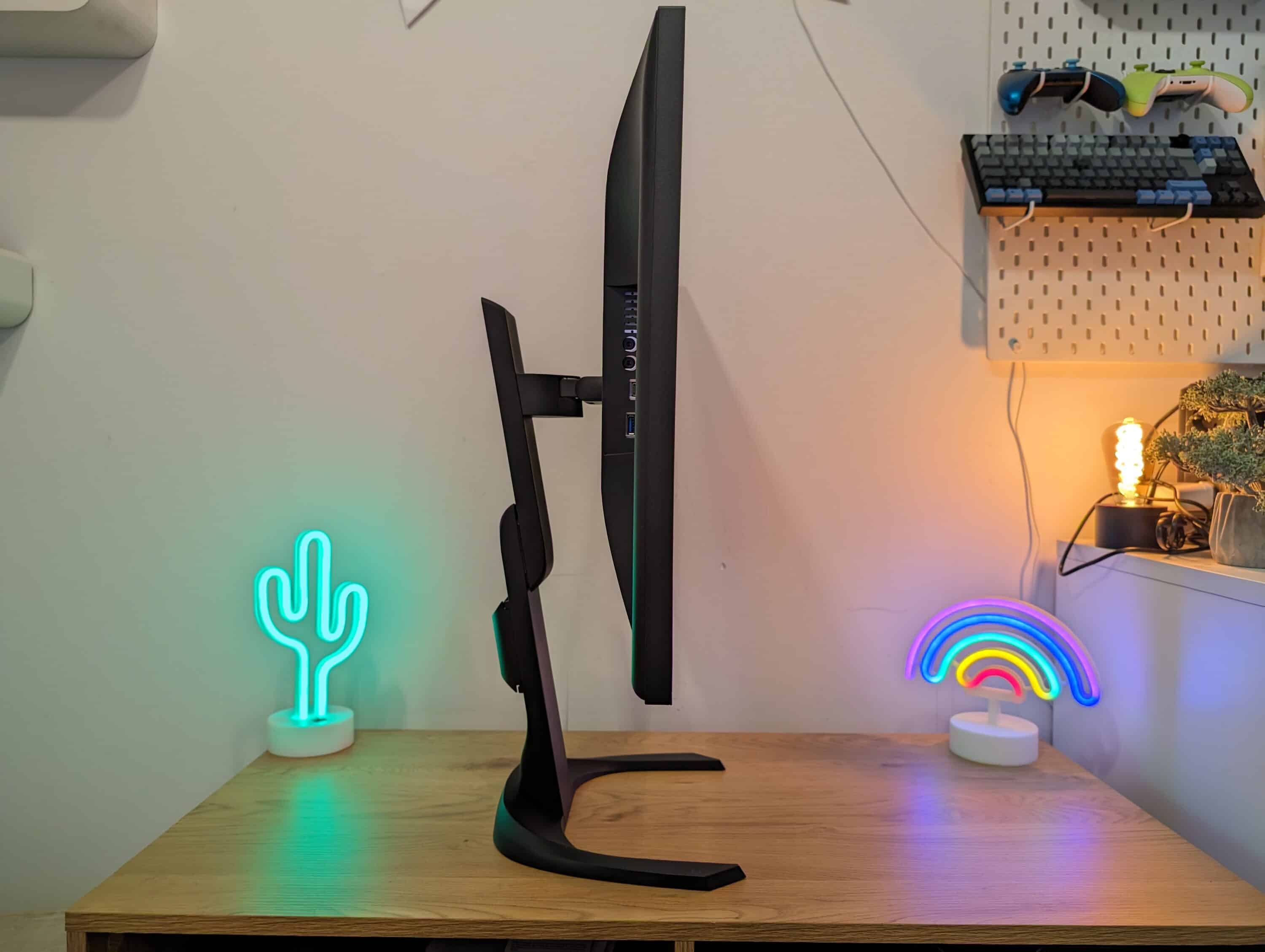 Der Standfuß ist U-förmig gestaltet und erlaubt eindrucksvolle ergonomische Anpassungen. Einerseits ist der Monitor um 19,5 cm in der Höhe verstellbar und kann dabei bis auf Höhe des Standfußes abgesenkt werden.