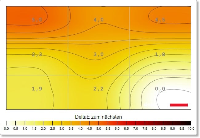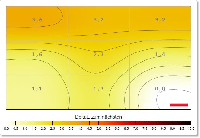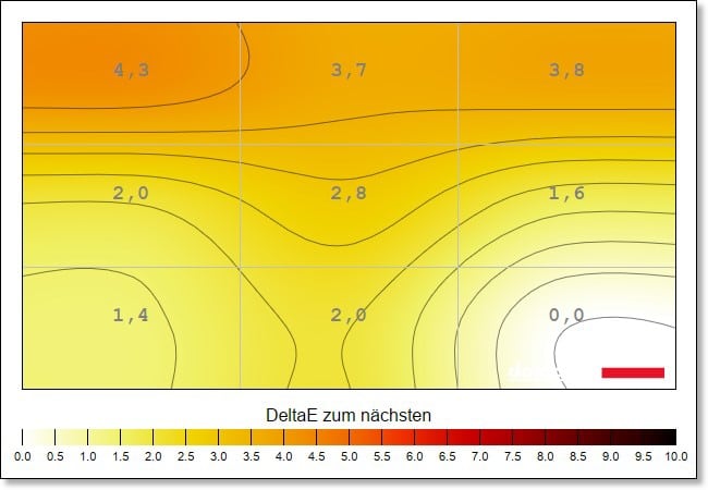 Hinsichtlich der Farbhomogenität, also der Gleichmäßigkeit der Farbverteilung, liefert der EIZO Monitor ebenfalls gute Ergebnisse ab. Interessanterweise ist das Rechteck in der unteren rechten Bildschirmecke am akkuratesten und nicht, wie so oft, die Bildmitte. Mit einer maximalen Abweichung von DeltaE 5,0 liegt das Bild auf sehr gutem Niveau.