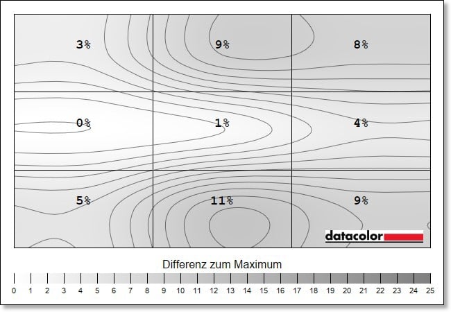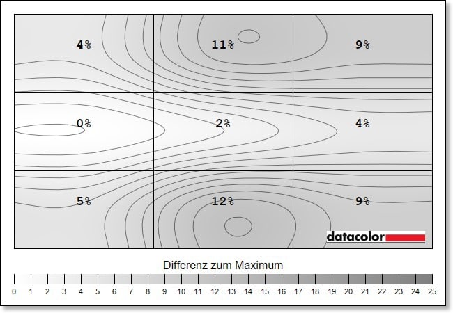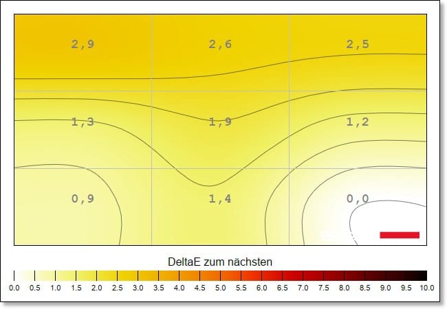 Nicht ganz so gut fällt hingegen die Luminanzhomogenität aus, die die Gleichheit der Ausleuchtung darstellt. Hier messen wir Abweichungen von bis zu 13 Prozent zum Maximum, das hier mittig am linken Rand zu finden ist.