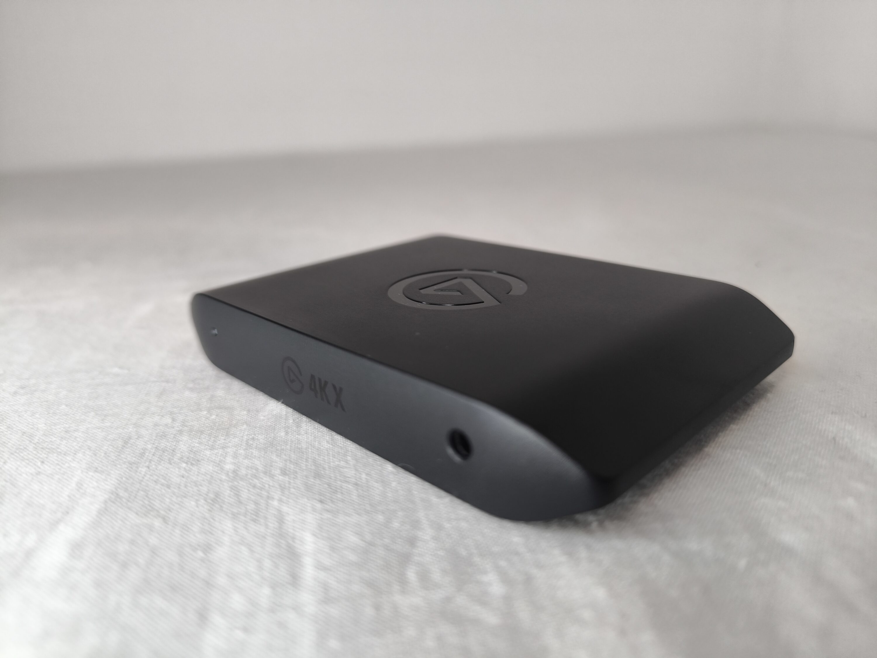 Die Oberseite des Elgato 4K X ist mit dem Logo des Herstellers verziert. Auf der Vorderseite befinden sich der Modellname und das Herstellerlogo sowie eine Klinkenbuchse und eine Status-LED. Auf der Rückseite befinden sich drei weitere Anschlussmöglichkeiten, darunter HDMI Out, USB-C und HDMI In. Um ein Verrutschen auf dem Tisch zu vermeiden, ist das Elgato 4K X an der Unterseite mit zwei Gummifüßen ausgestattet.