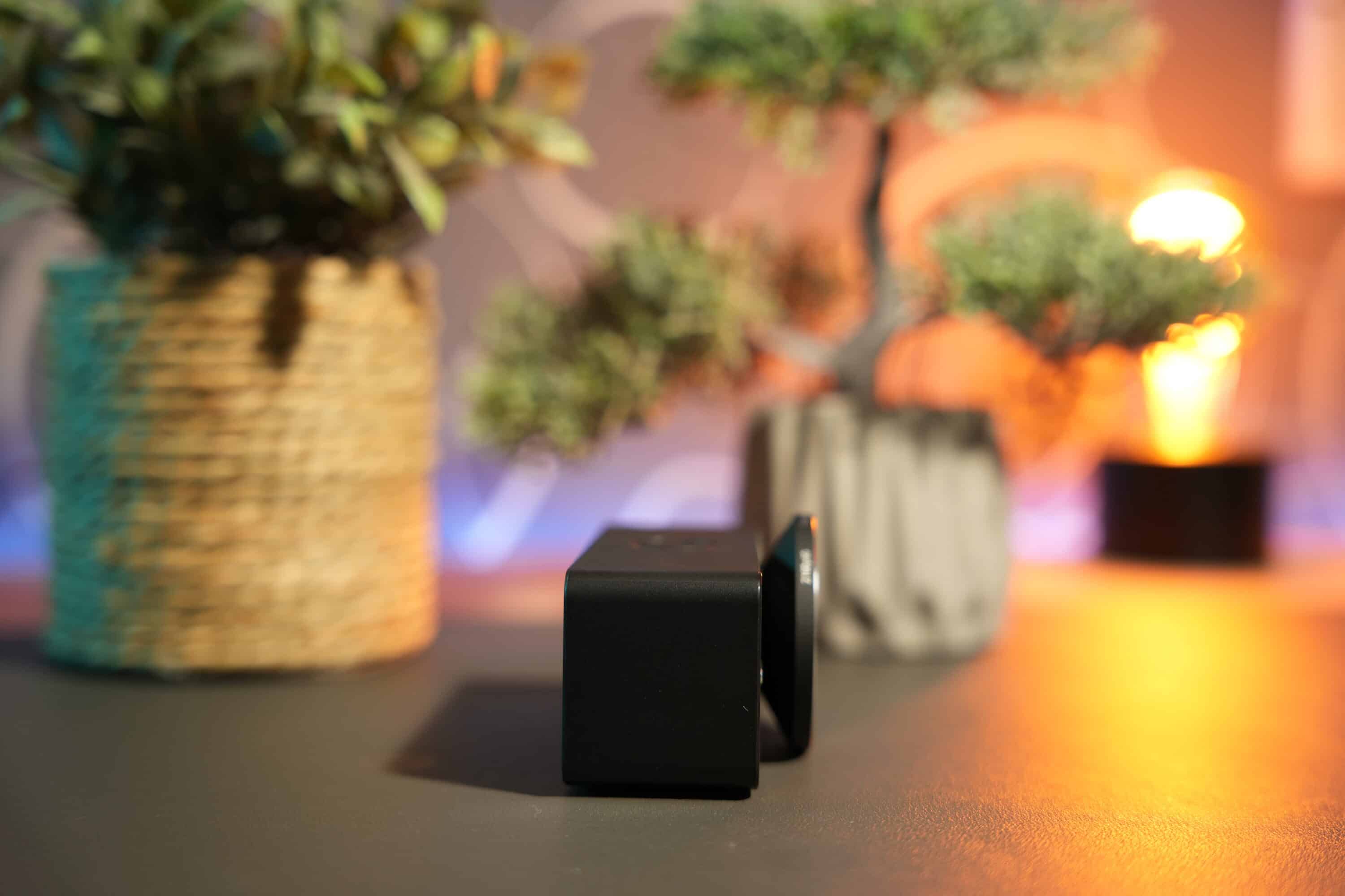 Links davon sorgt ein silbern abgesetzter Modellschriftzug für einen angenehmen Akzent, rechts sitzt eine Status-LED, die über den Betriebszustand informiert. Auffällig zeigt sich das deutlich aus dem Gehäuse hervorstehende Linsenelement und das aus gutem Grund. Doch dazu gleich mehr.