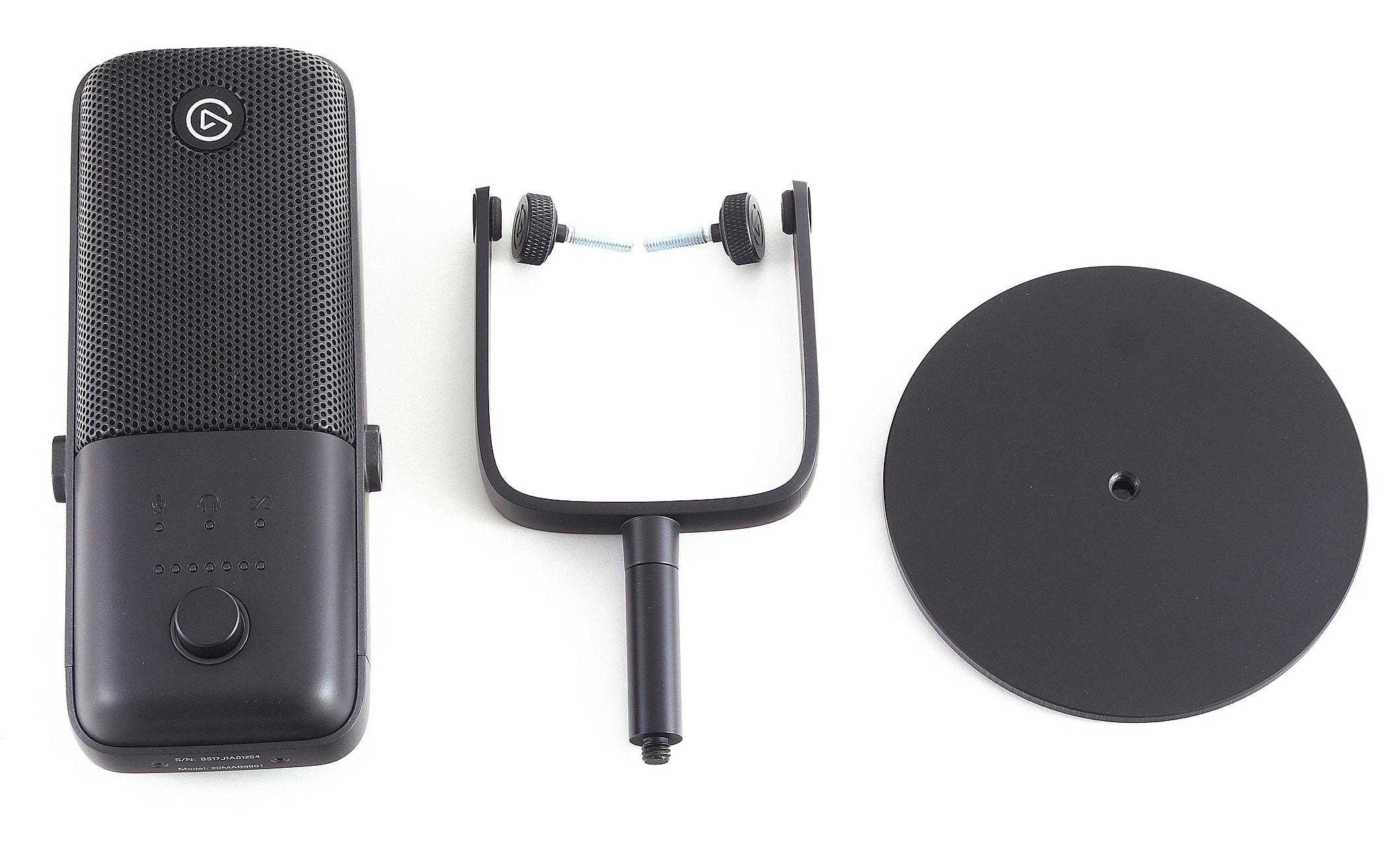 Beim Aufbau des Wave:3 hält sich Elgato an die üblichen Konventionen. Die Anschlusselektronik ist in einem Kunststoffgehäuse untergebracht, hinter dem schwarzen Metallgitter sitzt die Mikrofonmembran. Auch die Basisplatte und die Schrauben bestehen komplett aus schwarzem Metall, ebenso wie die untere Hälfte des Haltearms. Die Arme selbst sind hingegen aus Kunststoff.