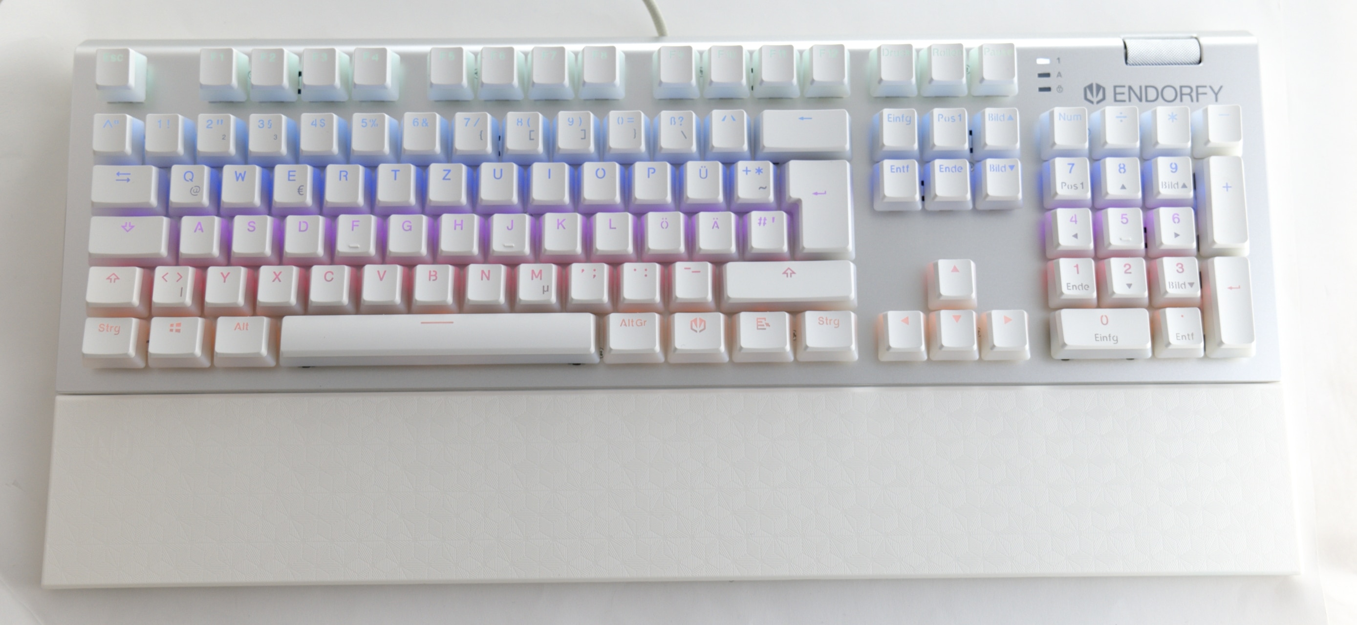 Optisch fällt das von uns getestete Modell natürlich insbesondere durch die helle Farbgebung auf: Weiße Tastaturen sind am Markt vergleichsweise selten. Das Zusammenspiel der metallisch-silbernen Bodenplatte aus Metall und den weißen Kunststoffelementen funktioniert – in unseren Augen – hervorragend. Dabei gibt sich Endorfy an der Tastatur selbst sehr zurückhaltend. Die Oberfläche ist komplett glatt, einzig oben rechts ist das Herstellerlogo aufgedruckt.