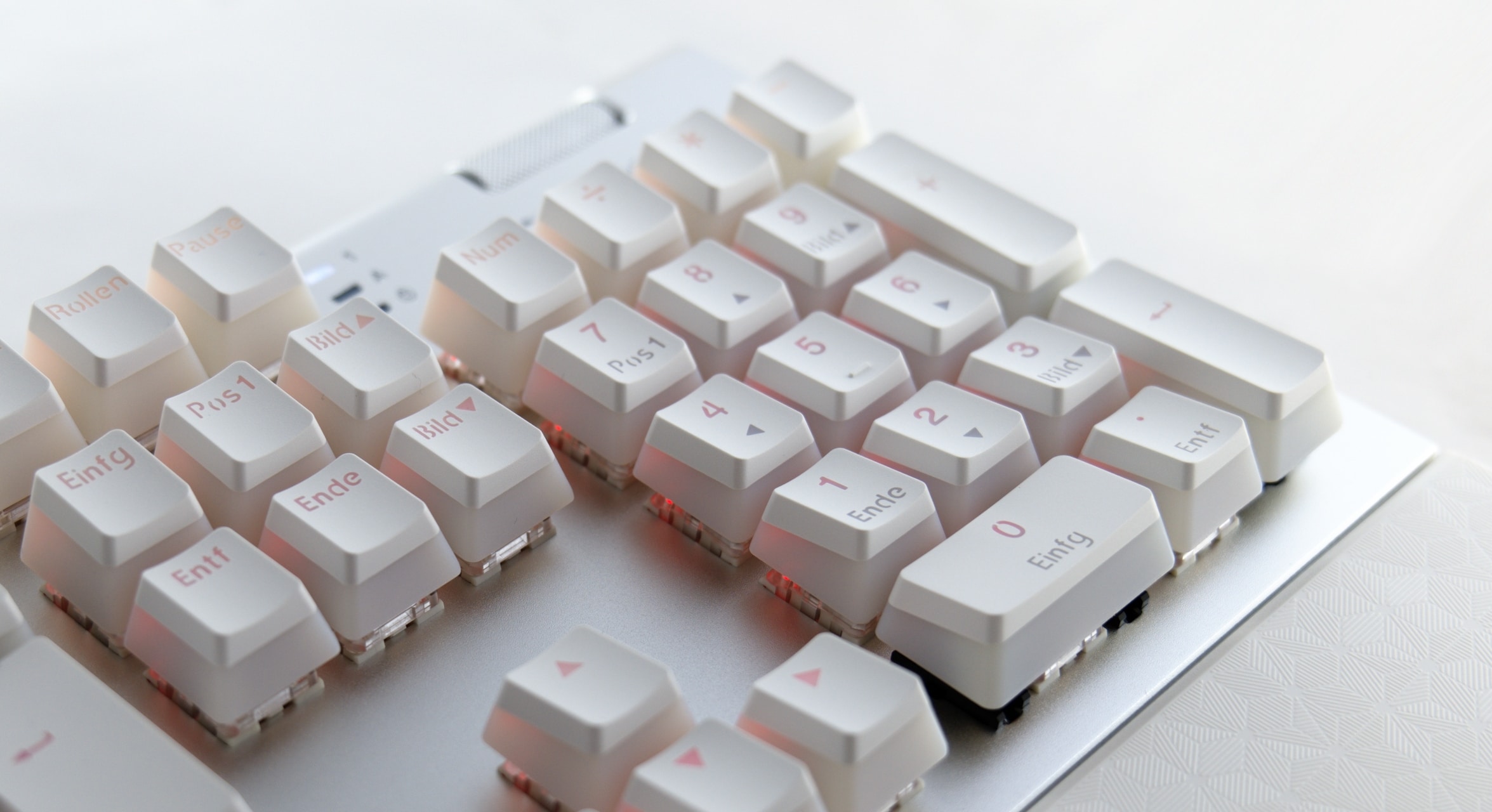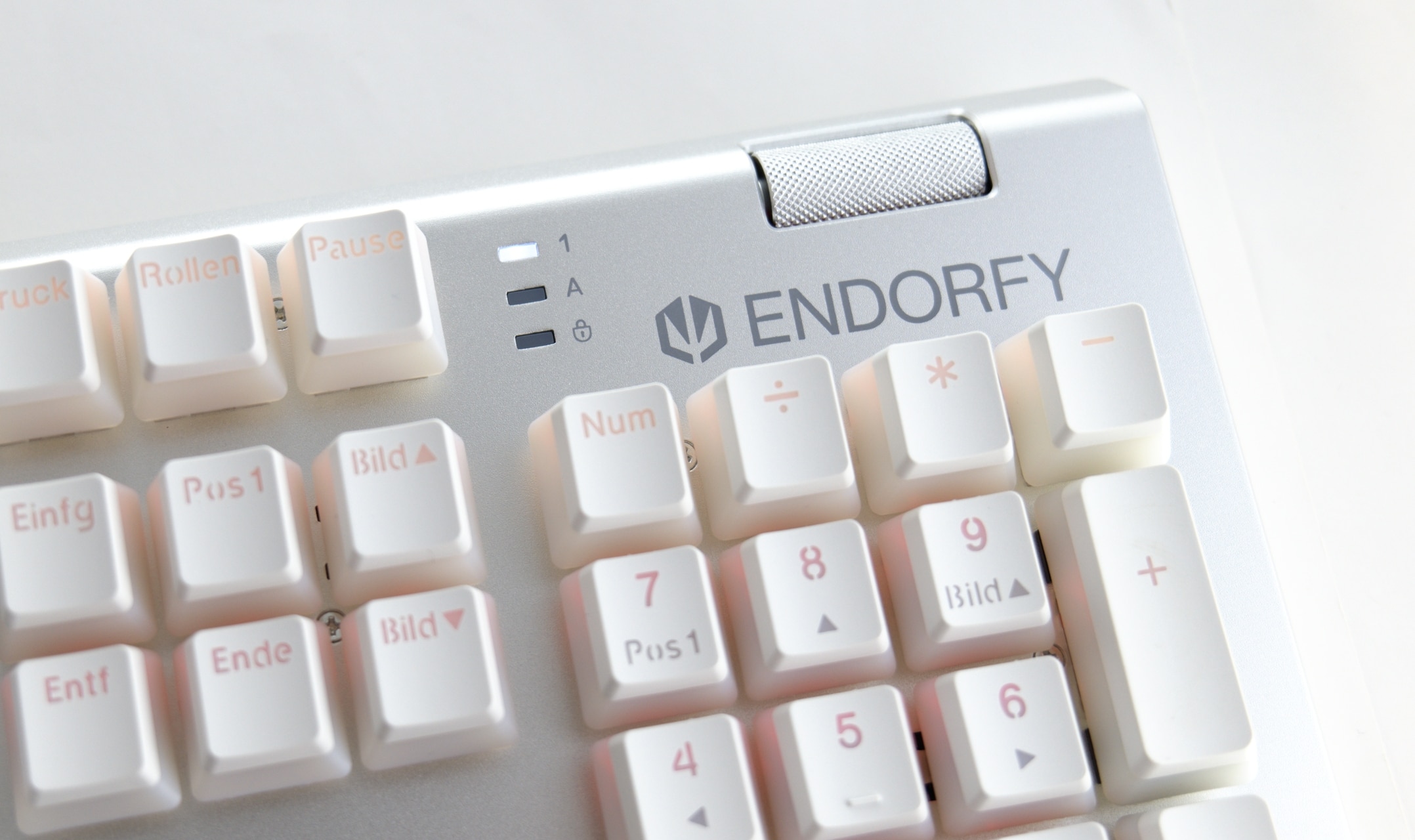 Die Endorfy Omnis Pudding setzt auf das übliche Standardlayout mit Nummernblock. Die einzige Abweichung befindet sich oben rechts: Dort wurde als Zusatz ein Lautstärkerad in das Gehäuse eingelassen. Zudem verzichtet Endorfy, wie schon bei der Thock, auf eine LED für die Rollen-Funktion. Stattdessen zeigt die dritte Status-LED den Status des Winlock-Features an.