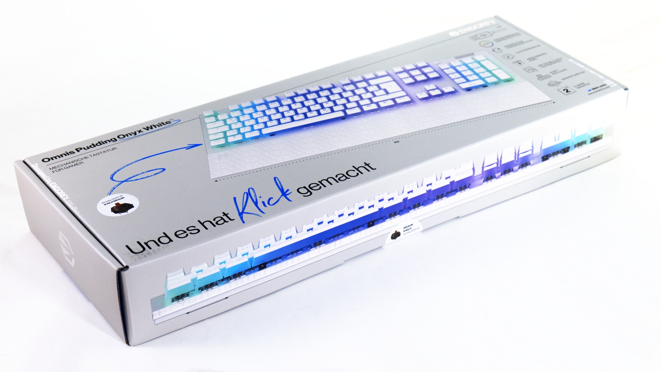 Wie schon die Thock wird auch die Endorfy Omnis Pudding in einem Karton mit hellem Design und bunten Aufdrucken geliefert. In dessen Inneren befinden sich die Tastatur selbst, eine kurze Anleitung, das 1,8 m lange Anschlusskabel sowie die abnehmbare Handballenauflage. Zudem wird auch hier ein Tastenkappenentferner mitgeliefert, der sich in einem Fach an der Unterseite der Tastatur befindet.