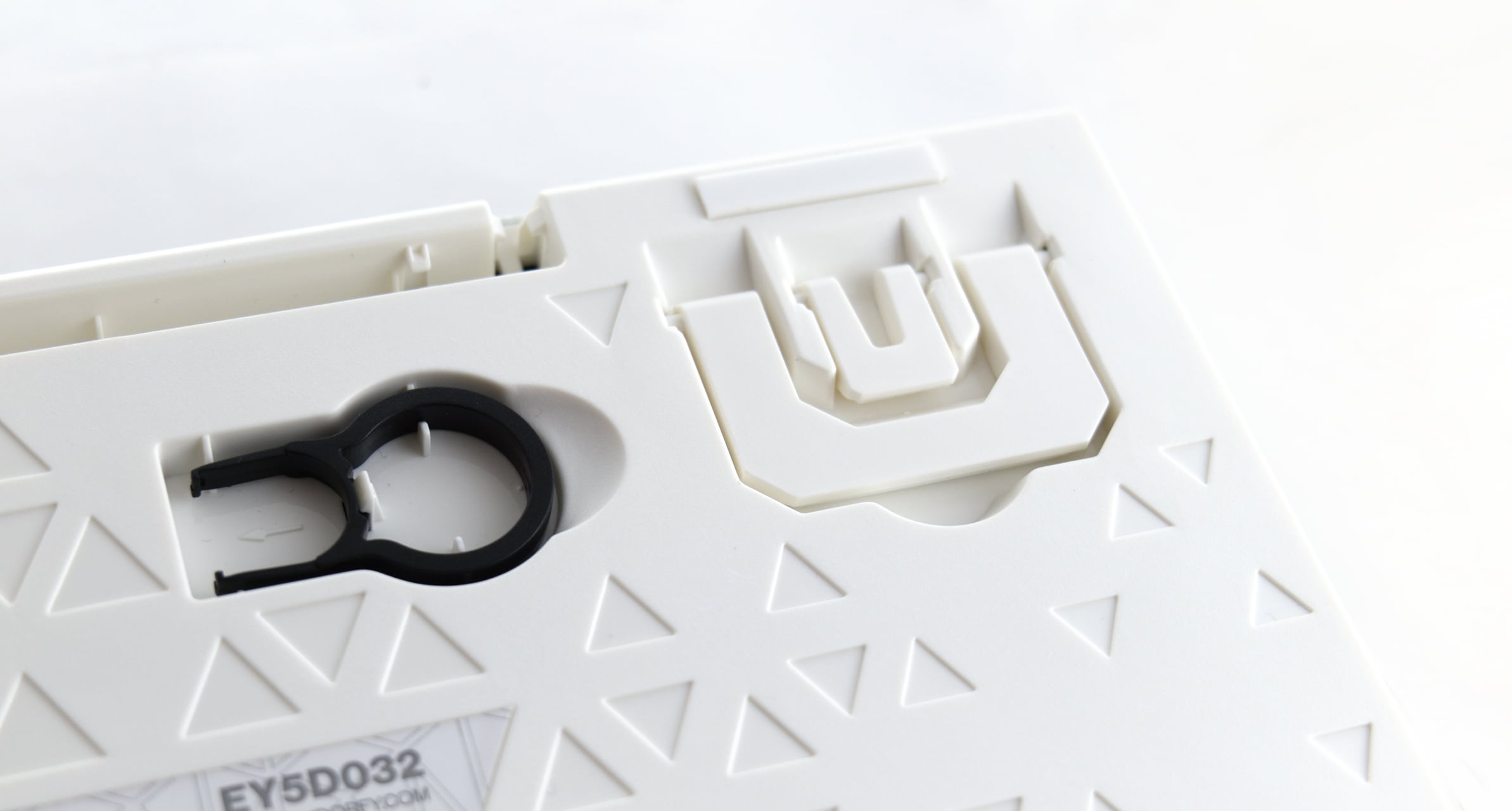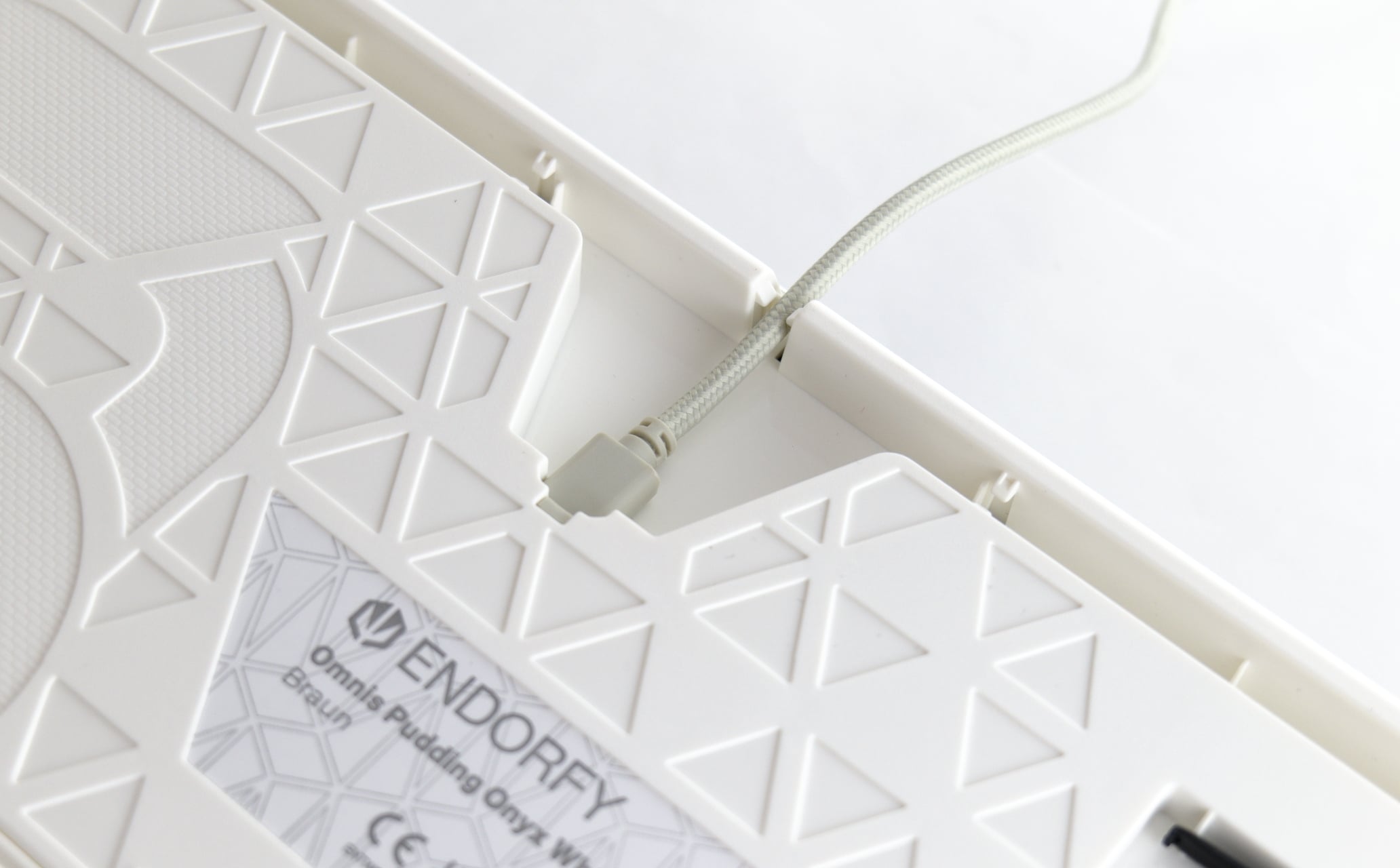 Während die sichtbaren Teile der Tastatur insgesamt eher schlicht gehalten sind, ist die Unterseite deutlich auffälliger gestaltet. Dort hat Endorfy in wildes Muster eingelassen. Spannender sind aber die dort vorgesehen Features: Die Omnis Pudding verfügt über einen integrierten Kabelkanal, in den man problemfrei das gesleevte Kabel einsetzen kann. Zudem sind dort zweistufige Stellfüße und ein Fach für den Tastenkappenentferner vorgesehen. Hier dürften damit kaum Wünsche offen bleiben.