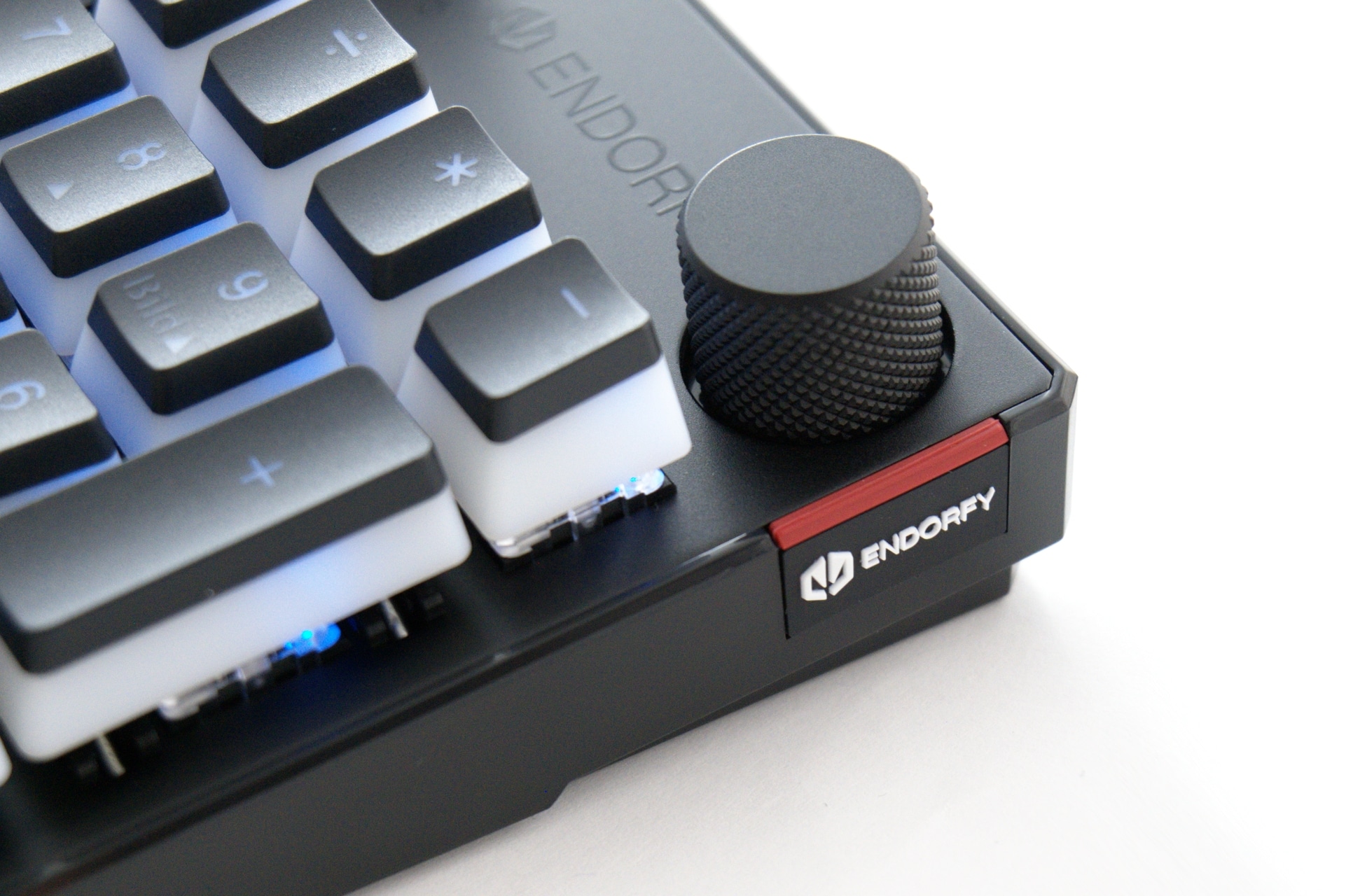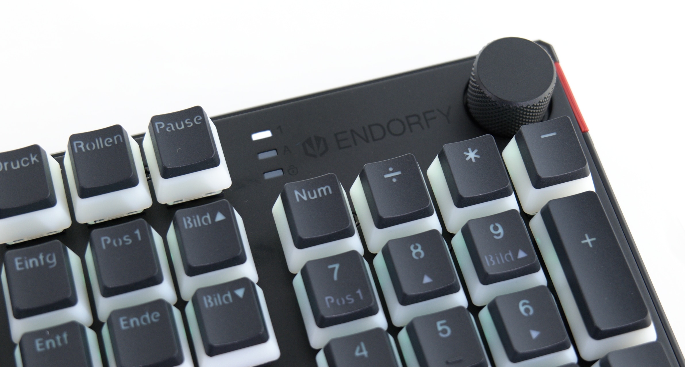 Die Endorfy Thock Pudding setzt auf einen typischen Aufbau. Die Elektronik befindet sich in einer Kunststoffwanne, wohingegen die Oberseite von der Metallplatte abgedeckt wird, die die Switches hält. Gleichzeitig macht das Unternehmen auch beim Layout keine Experimente: Es handelt sich um die üblichen 104 Tasten in der klassischen Anordnung. Ergänzt werden diese durch einen Lautstärkeregler oben rechts, den man drücken kann, um den Klang stummzuschalten. Außerdem sind dort auch die drei Status-LEDs untergebracht, die aber nicht mit den üblichen Funktionen belegt wurden. Die Rollen-LED existiert hier nicht, stattdessen zeigt die dritte Anzeige den Status der Winlock-Funktion an.