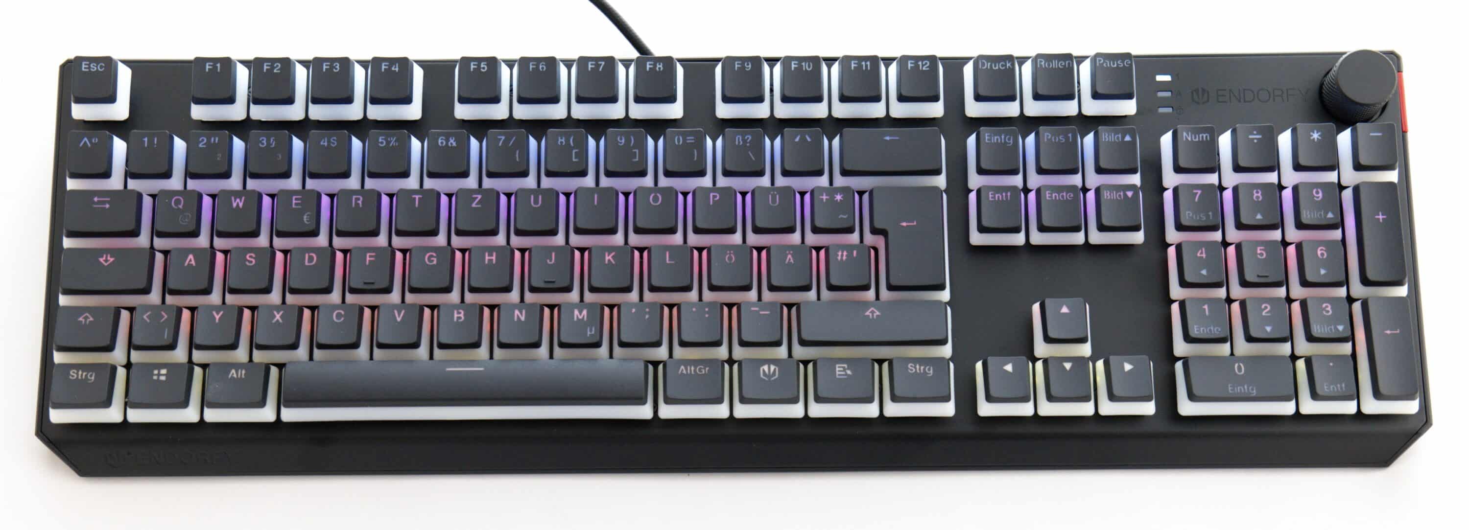 Auch das große Alleinstellungsmerkmal der Thock Pudding, die Beleuchtung, ist in unseren Augen gut umgesetzt. Durch die beleuchteten Tastenkappen wirkt das Modell deutlich bunter als viele Konkurrenzmodelle. Ob einem das gefällt, ist natürlich Geschmackssache. Wenn das aber der Fall ist, kann die Pudding hier durchaus hervorstechen. Konstruktionsbedingt ist dabei aber die Ausleuchtung ein Problem: Wie üblich ist die RGB-LED oben an den Switches verbaut, sodass insbesondere beim Blick auf die Seiten der Tastenkappen die schwankende Lichtintensität auffällt. Im Gegenzug wird so aber ein Farbverlauf erzeugt, da die Unterseite von der Farbe der darunterliegenden Taste beeinflusst wird. Dass Endorfy hier auf die übliche Beleuchtungs-Lösung setzt, hat also auch Vorteile.