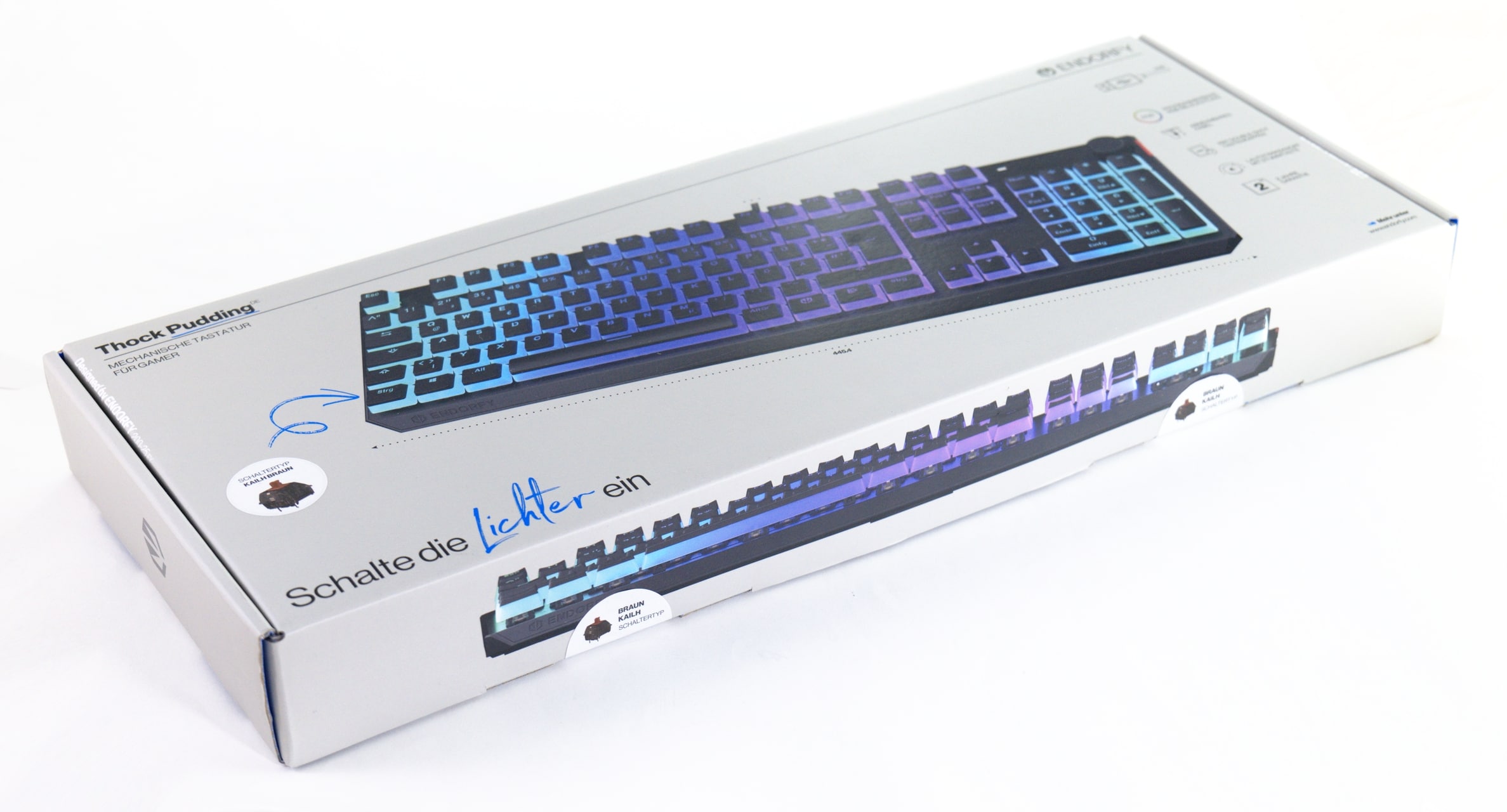 Das polnische Unternehmen Endorfy bietet inzwischen zahlreiche Gaming-Produkte an, darunter auch Tastaturen. Ebendiese gliedern sich in zwei Gruppen: Die etwas günstigeren Thock-Modelle und die teureren Omnis-Tastaturen. Beide Produktgruppen werden dabei in verschiedenen Konfigurationen angeboten, und eine ebensolche wollen wir uns heute ansehen: Die Endorfy Thock in der Pudding-Variante, mit vollem Layout und mit Brown-Switches von Kailh.