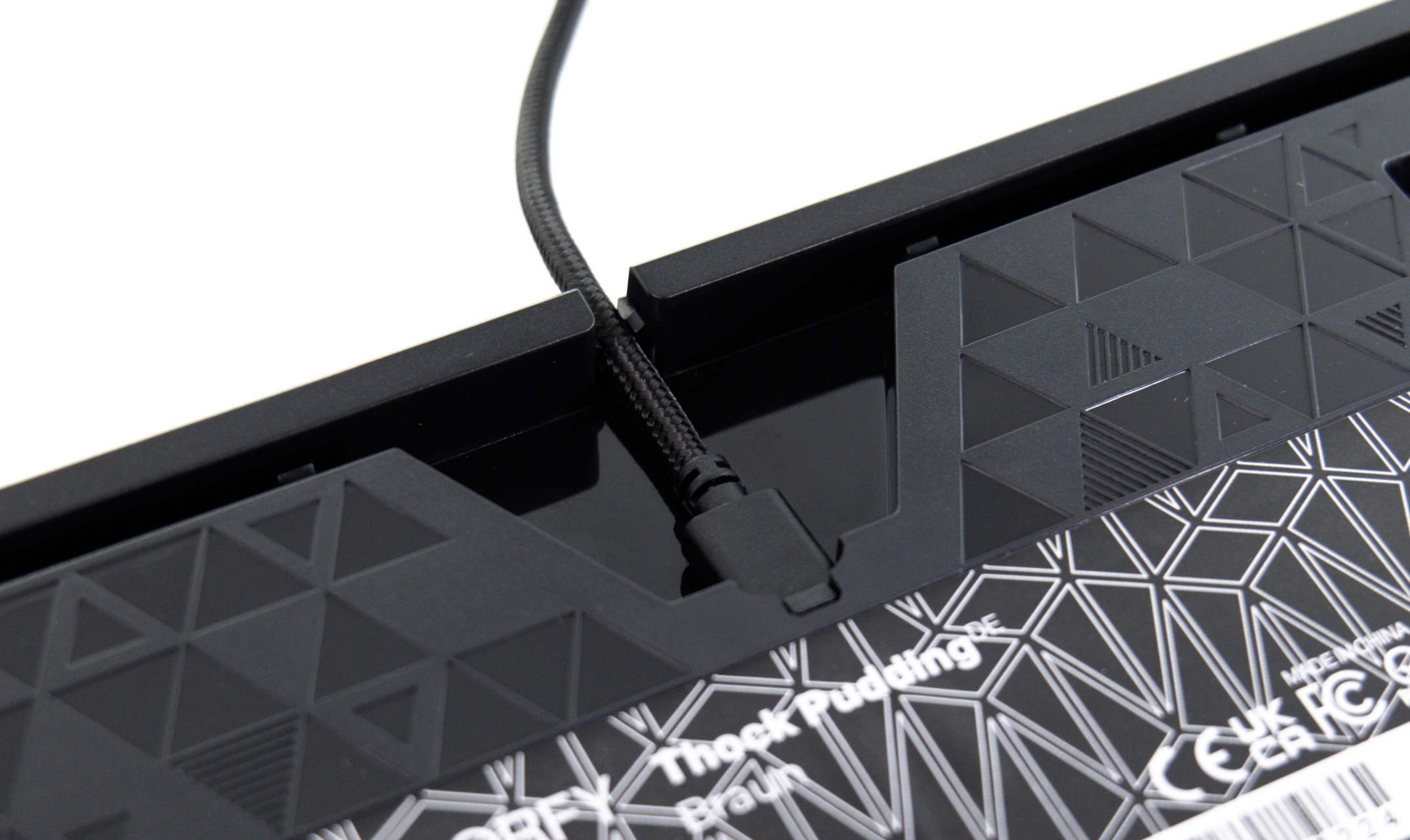 Eigentlich ist die Thock Pudding weitgehend schlicht gehalten: Fast alle sichtbaren Oberflächen sind mattschwarz, lediglich an der rechten Seite weist ein roter Streifen auf das Herstellerlogo hin. Durch ihre ungewöhnlich gestalteten Tastenkappen, bei denen nur die Oberseite lackiert ist, weicht sie aber dennoch deutlich von der Masse ab. Insbesondere mit aktivierter Beleuchtung wird die Thock damit zum Hingucker.
