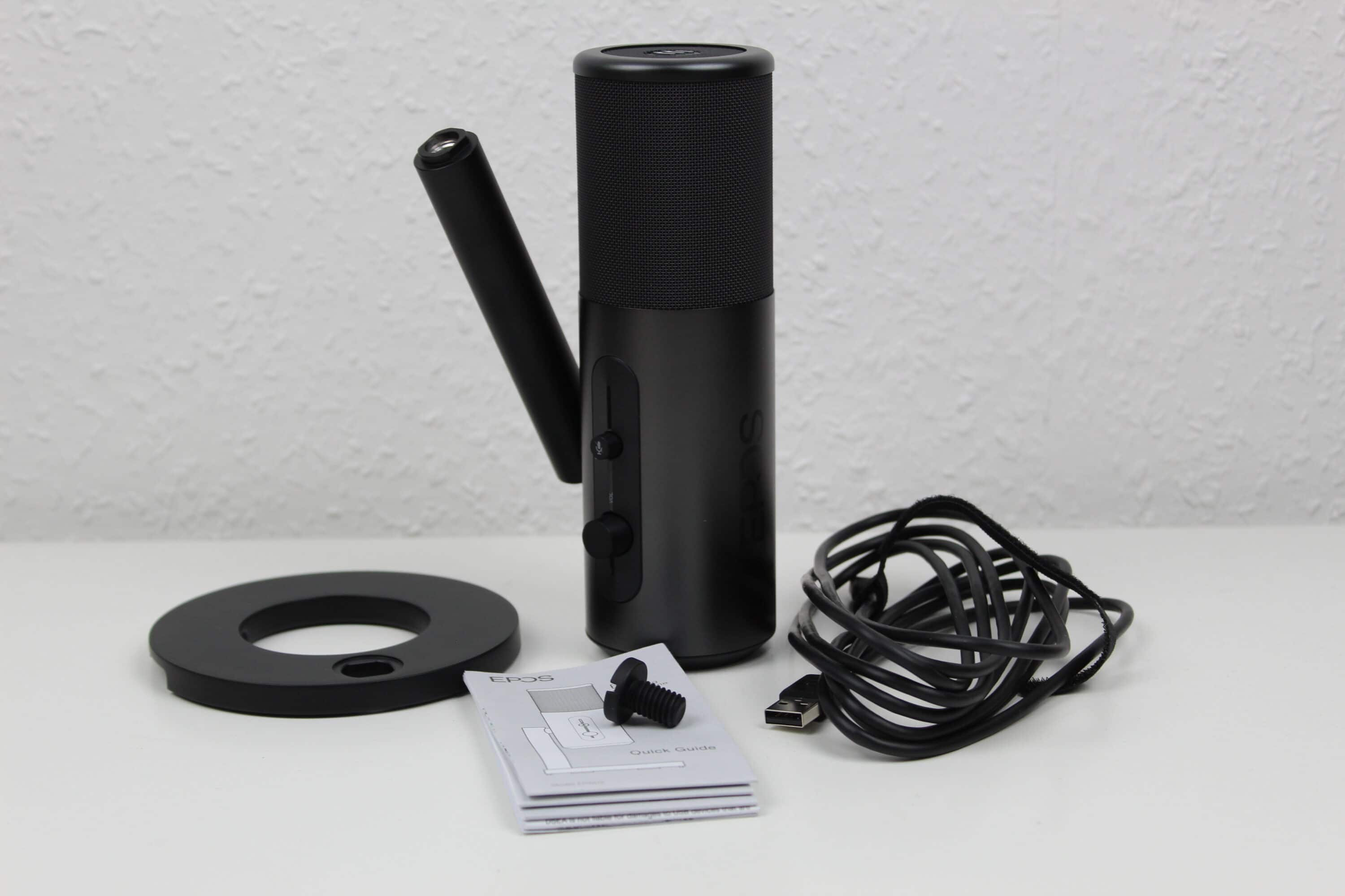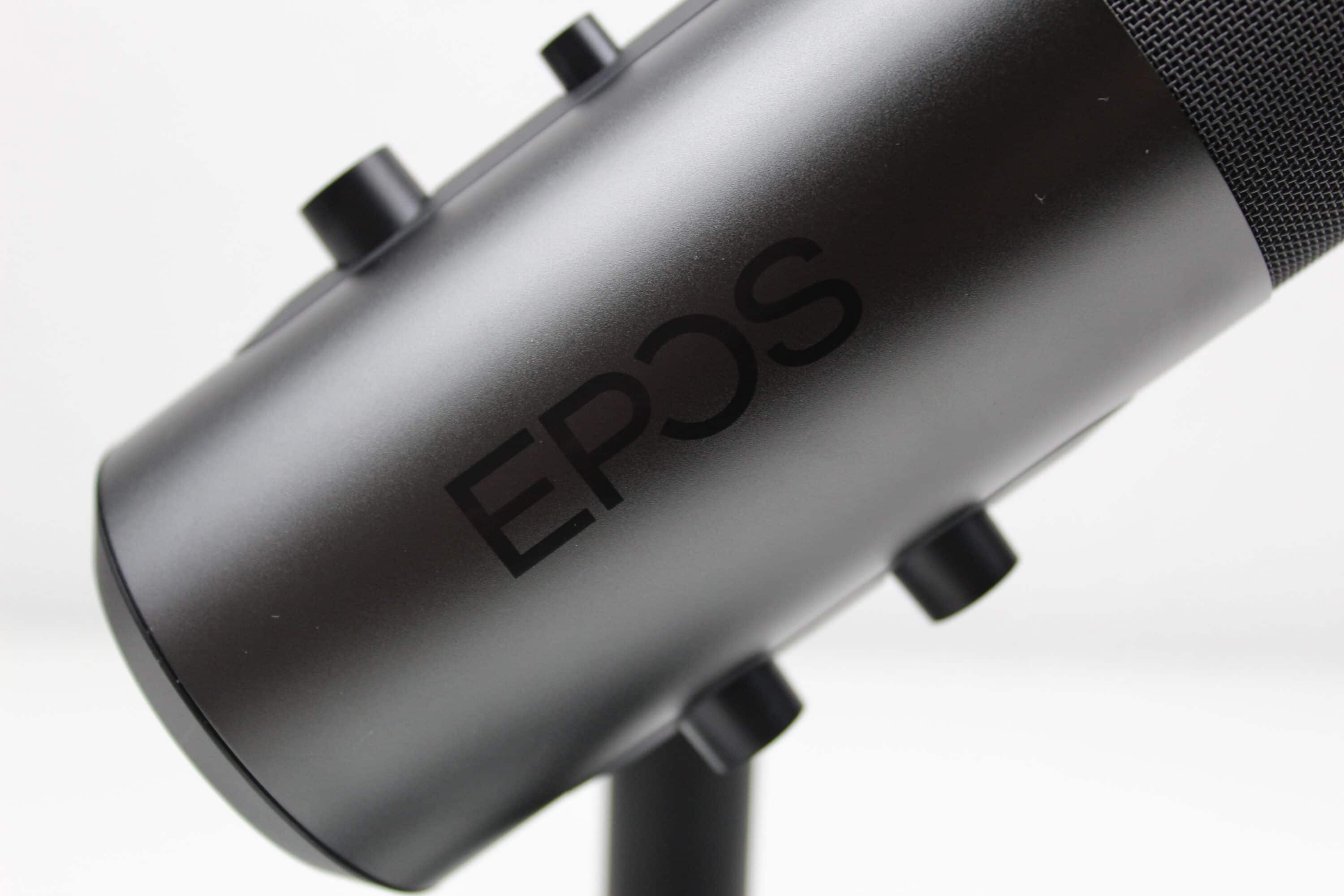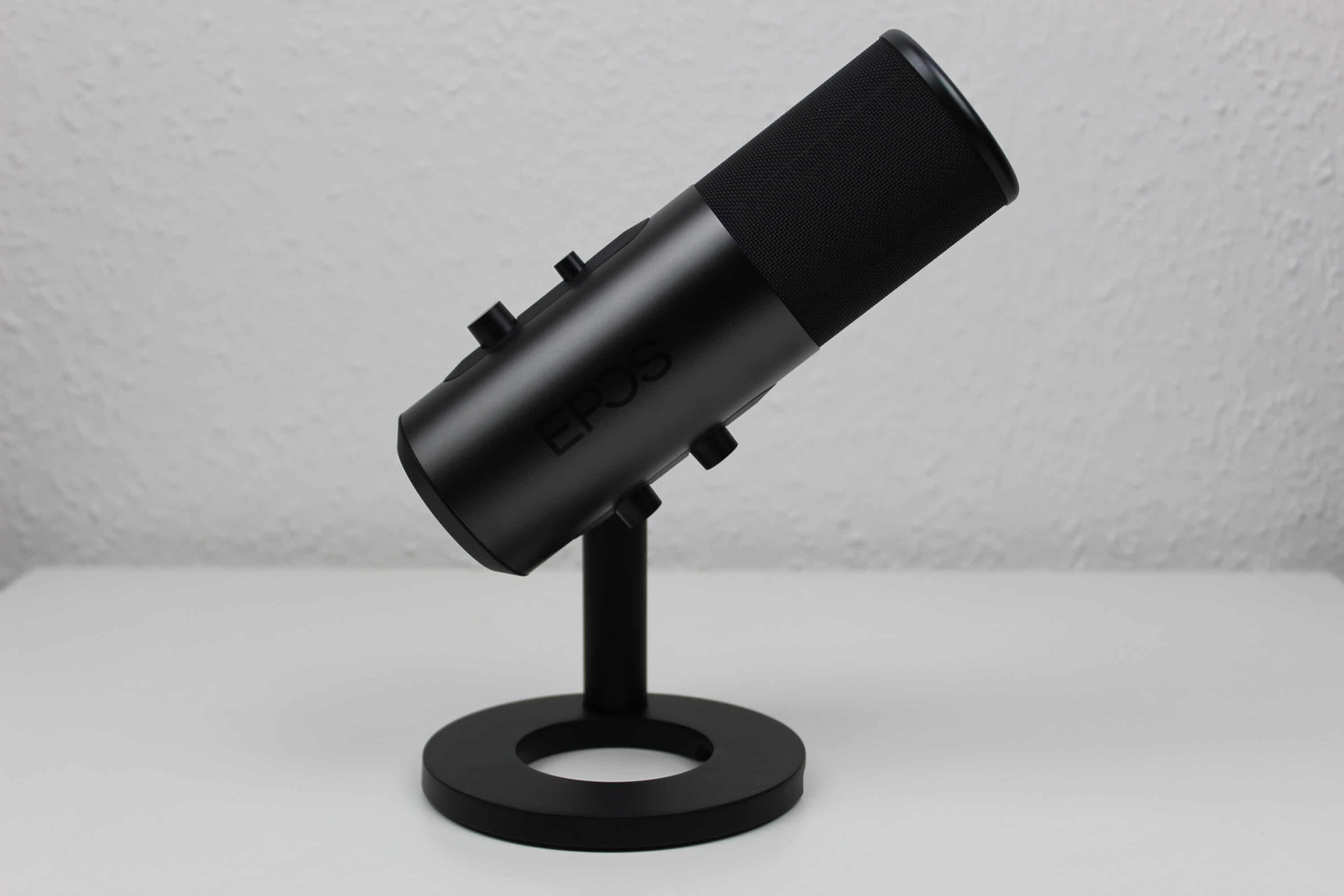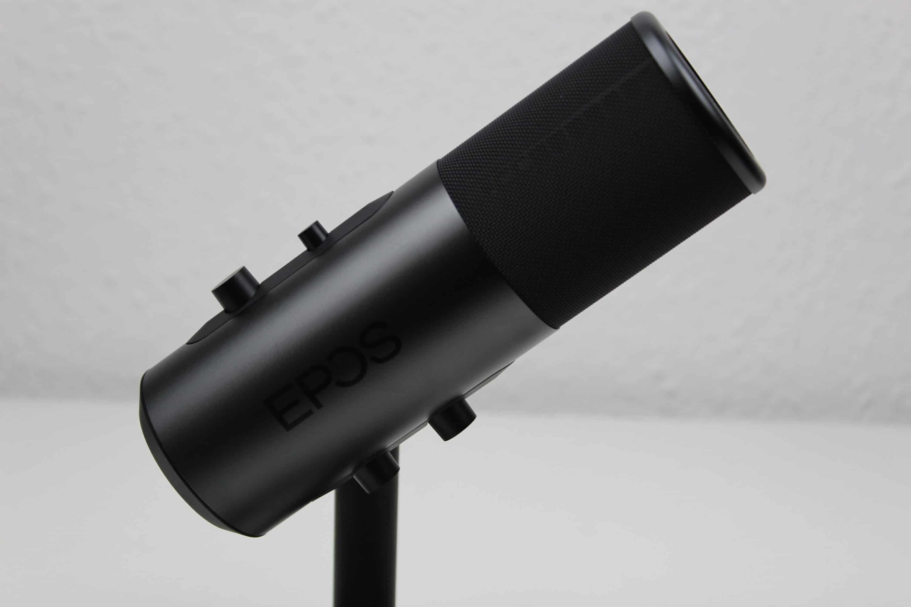 Das Mikrofon ist optisch recht schlicht gehalten. In einem leicht glänzenden, dunkelgrauen Korpus sind Knöpfe zur Stummschaltung, Gain-Pegel, Lautstärke-Pegel und die Mikrofoncharakteristik eingelassen. Das eigentliche Mikrofon liegt oben hinter einem Gitter, von oben ist das EPOS-Logo zu sehen. Auffällig ist das geringe Gewicht, die Verarbeitung wirkt jedoch durchweg überdurchschnittlich. Die Knöpfe lassen sich angenehm drehen bzw. drücken, optische Mängel sind nicht vorhanden, das Material fühlt sich wertig an. Über dem Mute-Knopf ist eine kleine LED-Leiste, bei normaler Nutzung leuchtet diese weiß, sobald stumm geschaltet wird, ist hier ein rotes Leuchten zu sehen.