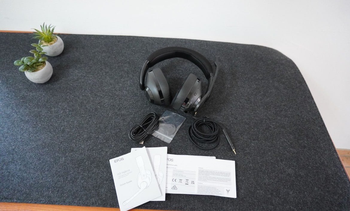 Hier offenbart sich bereits der erste Unterschied zum Quasi-Vorgänger H3, dem der Hersteller lediglich in 3,5-mm-Klinkenkabel (samt der obligatorischen Anleitungen und Sicherheitshinweise) beilegte. Dieses findet sich auch in der Verpackung des EPOS H3 Hybrid, wird allerdings durch ein USB-A-auf-USB-C-Kabel ergänzt.