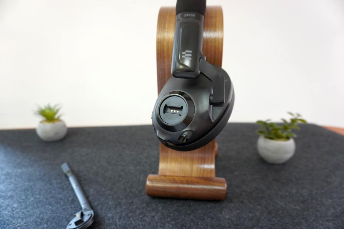 An der Unterseite der linken Ohrmuschel finden sich die Anschlüsse für das 3,5-mm-Klinkenkabel zum Ansteuern externer Audio-Quelle, sowie der USB-Typ-C-Anschluss zur kabelgebundenen Verbindung mit dem PC beziehungsweise zum Aufladen des Akkus. Darüber positioniert EPOS eine LED-Anzeige, die in drei Farben über den Akkustand informiert, sowie den Knopf, der das Gaming-Headset überhaupt erst aus- oder einschaltet.