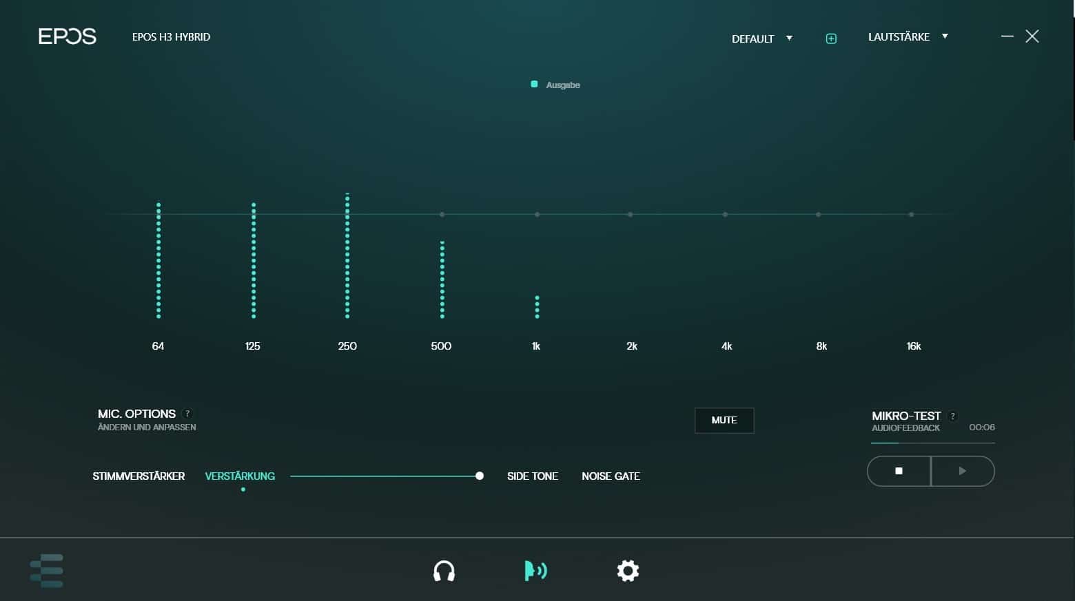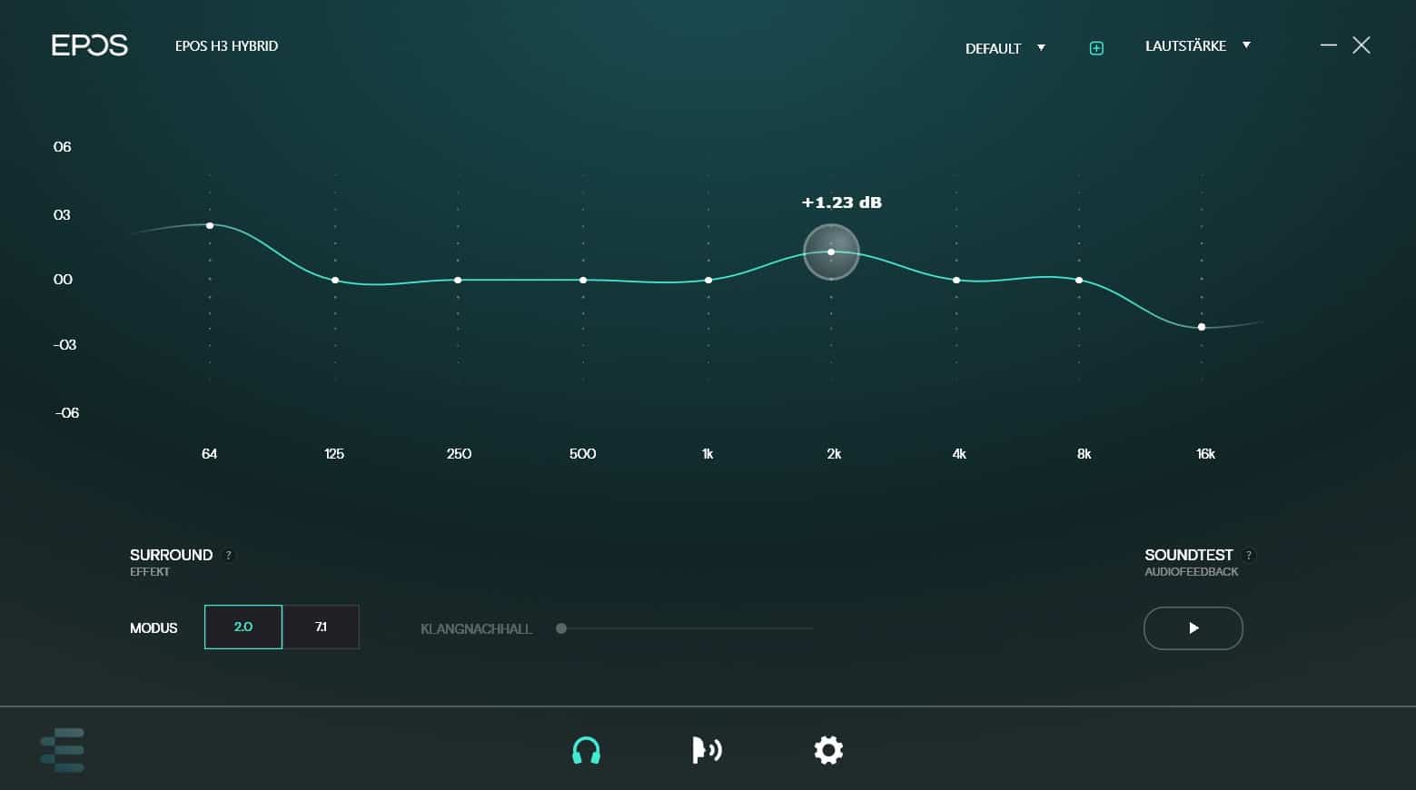 Außerdem stehen euch in der Software umfangreiche Optionen zur Individualisierung des Klangs von Kopfhörern und Mikrofon zur Verfügung. Wie bereits erwähnt, könnt ihr den Equalizer individuell in neun Frequenzen verändern und, im 7.1-Surround-Modus, einen Nachhall hinzufügen. Die EPOS Gaming Suite kommt deutlich kompakter und aufgeräumter daher als manch andere Headset-Begleitsoftware und konzentriert sich dabei auf das Wesentliche.