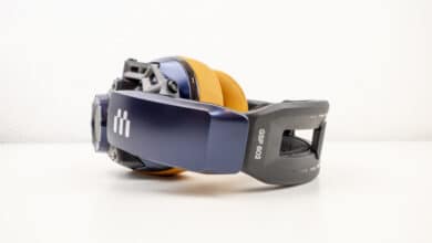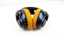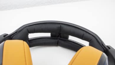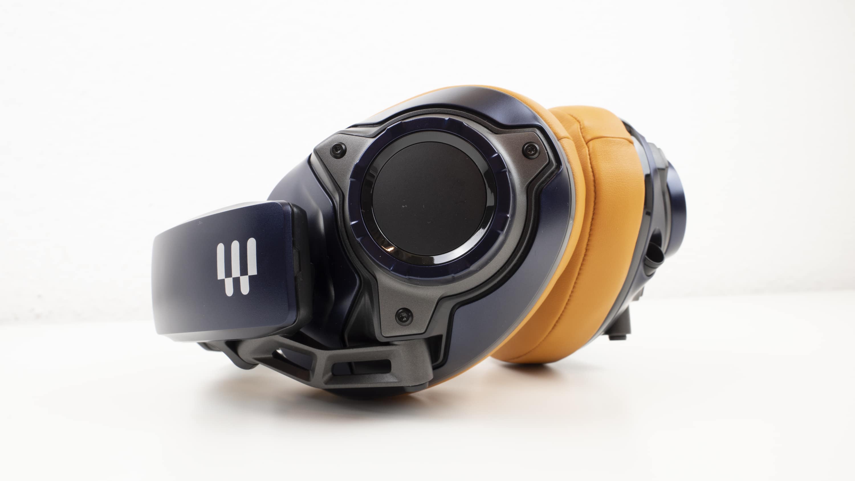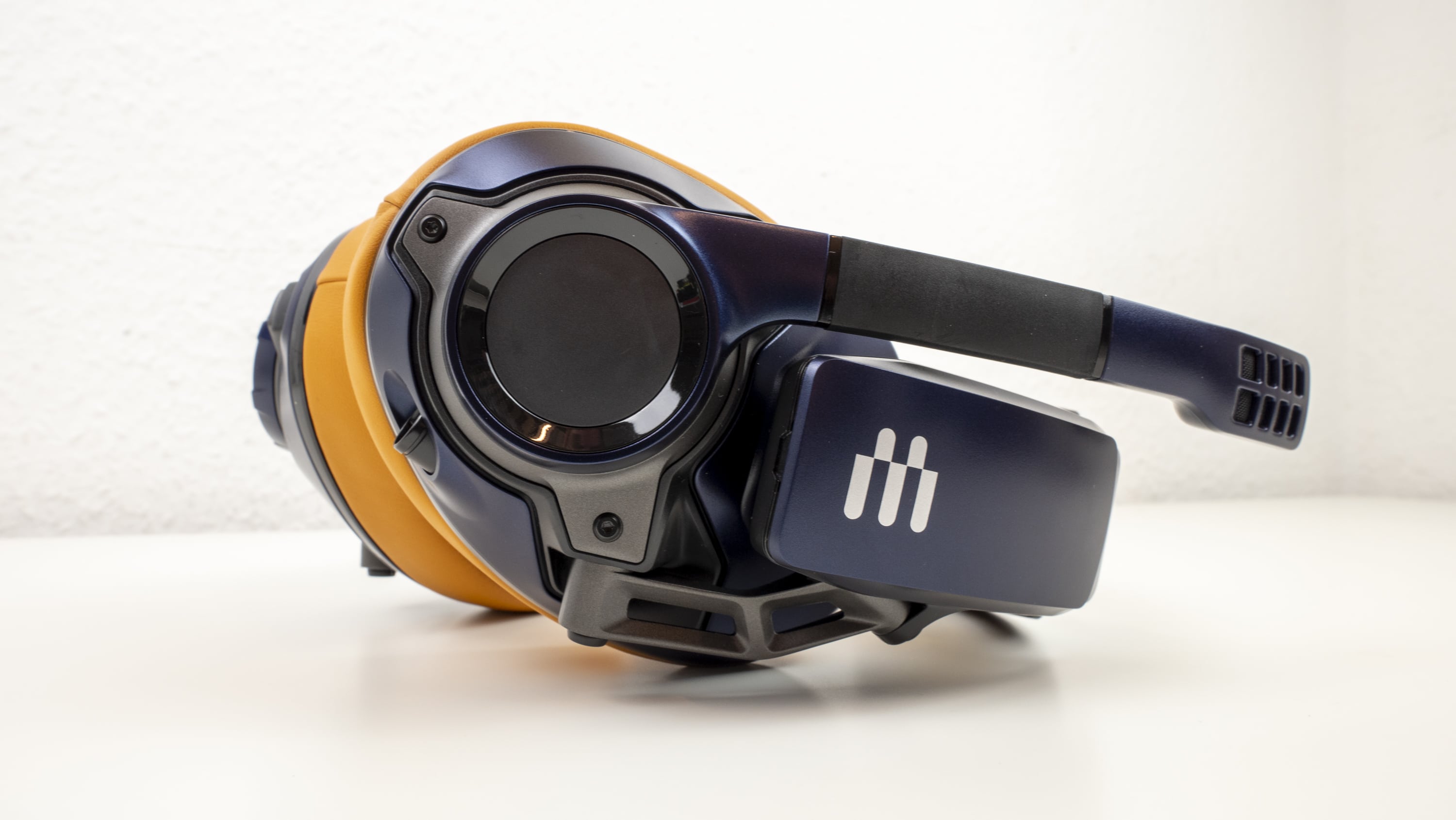 Das Headset selbst wirkt zwar riesig, ist jedoch deutlich leichter als seine Optik erwarten lässt. Es bringt 395 Gramm auf die Waage – sein wuchtiges Aussehen ließ uns zunächst noch mehr vermuten. Zu besagtem Aussehen führen vor allem die schier riesigen Ohrpolster, die noch einmal von aus Kunststoff gefertigten Trägern umgeben sind.