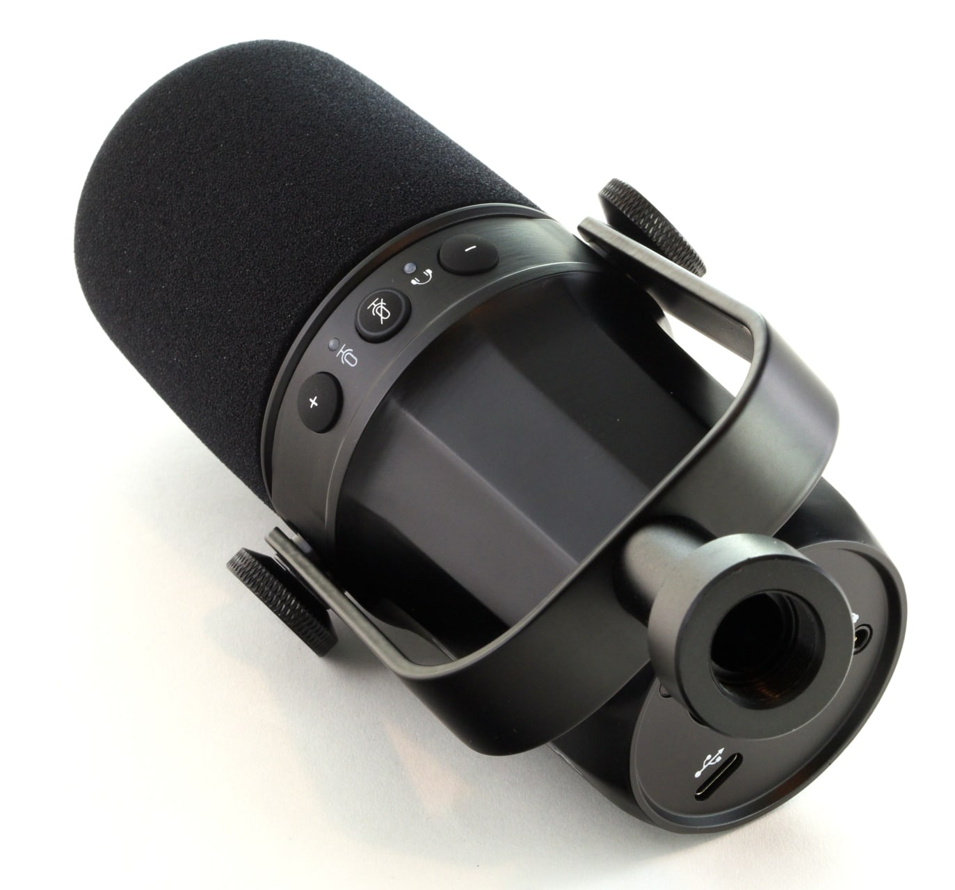 Sämtliche Anbindungsmöglichkeiten des Mikrofons sind an der Unterseite untergebracht, an der sich der XLR-, der USB-C- und der Klinkenanschluss befinden. Die Bedienung erfolgt hingegen über drei Taster an der Vorderseite: Mit diesen kann die Lautstärke des Mikrofons und der verbauten Klinkenbuchse verändert und das Mikrofon stumm geschaltet werden. Die entsprechenden Aufdrucke sind dabei „falschrum“ aufgedruckt – das SL40 ist also für eine Bedienung von „oben“ konzipiert.