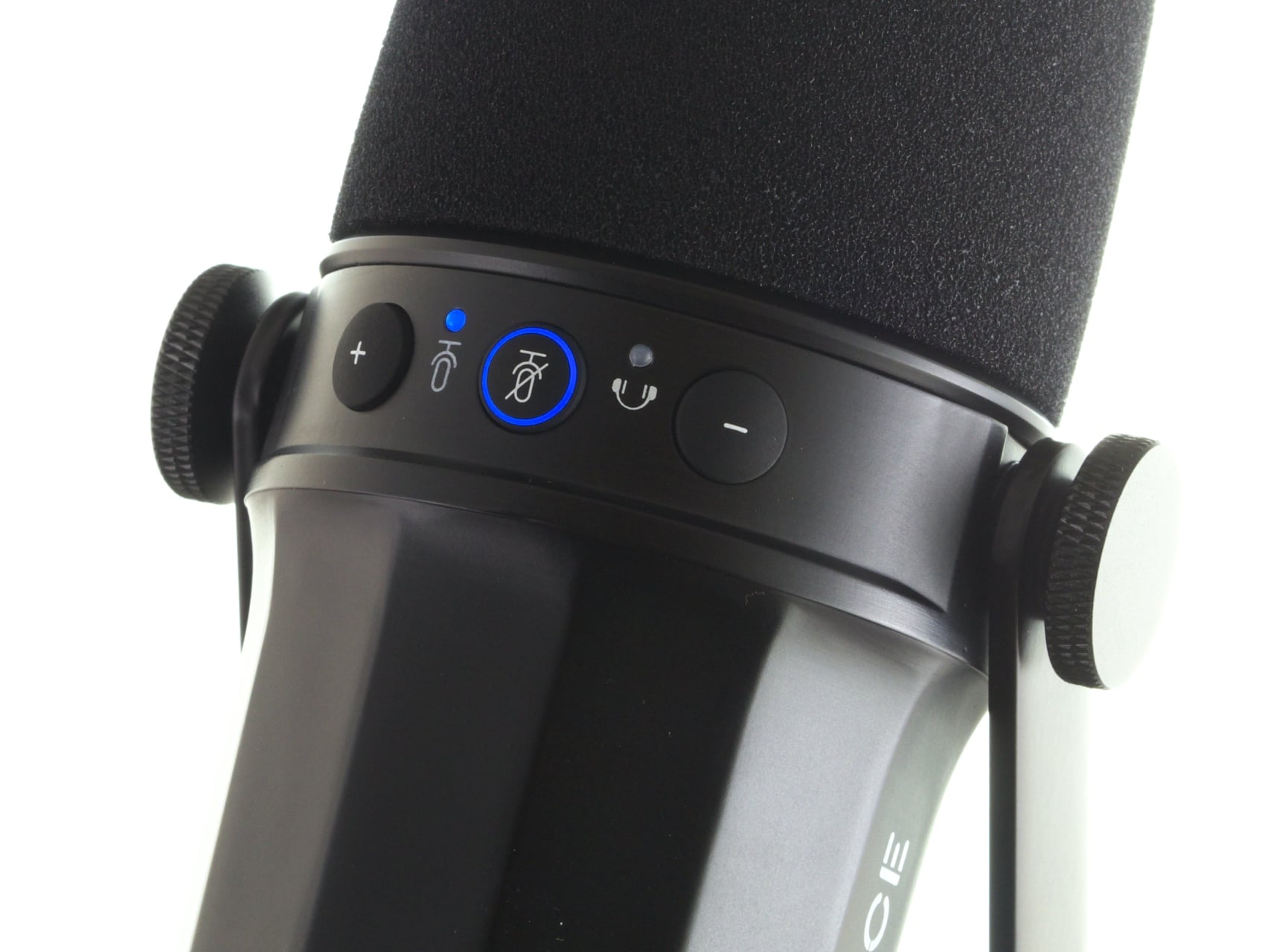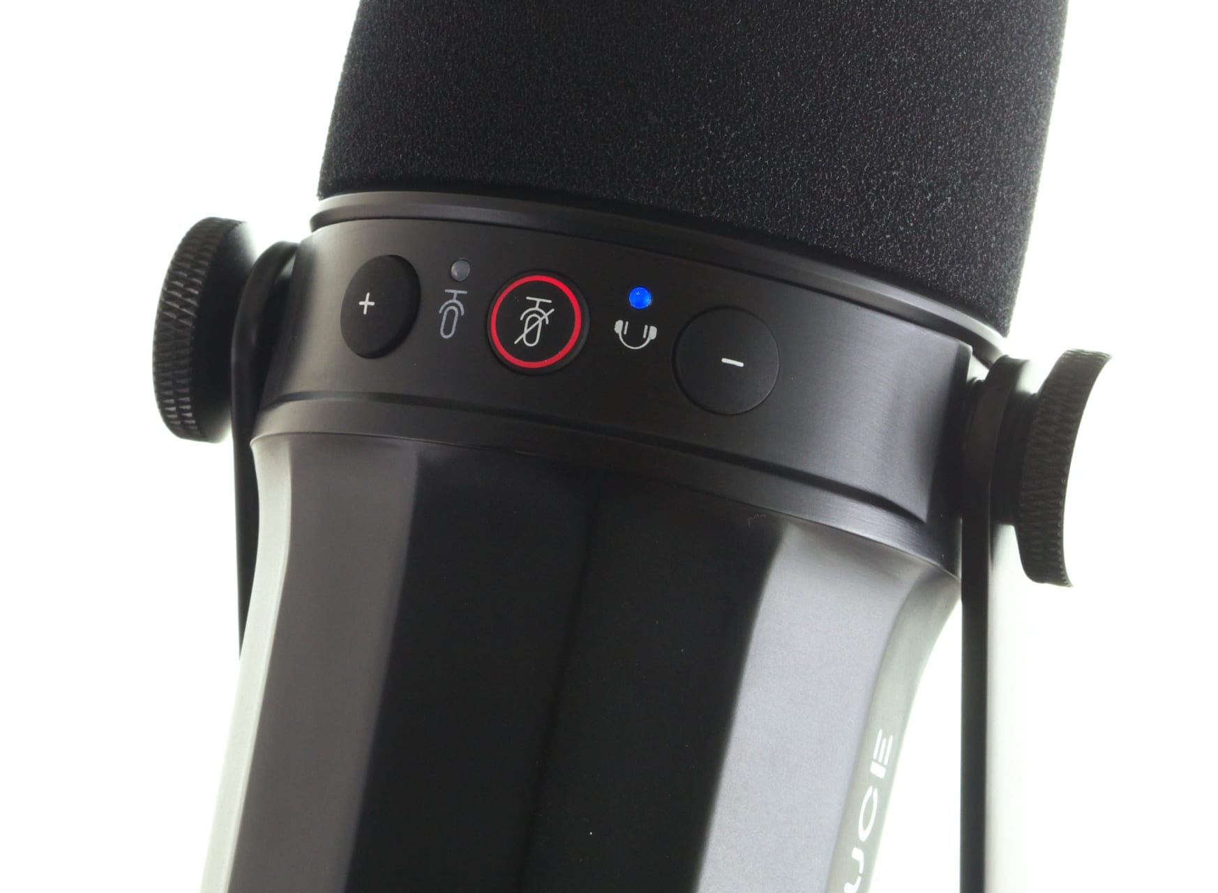 Je nach der gewählten Anbindungsart ergeben sich Unterschiede beim SL40. Wird das Mikrofon per USB angeschlossen, so leuchtet es auf: Der mittlere Button signalisiert mit blauer beziehungsweise roter Farbe die Mute-Funktion. Links und rechts davon sind außerdem zwei weitere, blaue LEDs untergebracht, die anzeigen, ob mit den beiden weiteren Tasten die Aufnahmeverstärkung oder Wiedergabelautstärke des Headsets an der Klinkenbuchse verstellt wird.