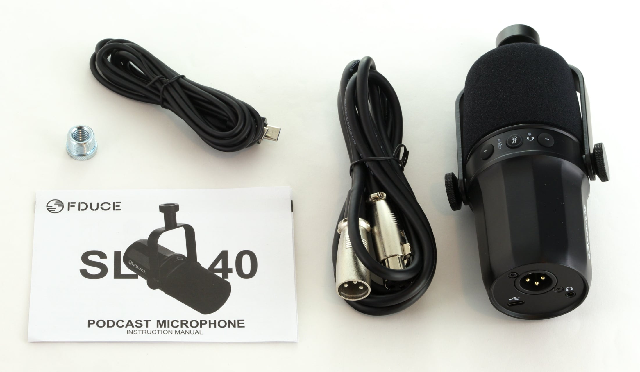 Das FDUCE SL40 wird ein einem farbig bedruckten Karton angeliefert. Darin befinden sich, in schwarzem Schaumstoff verpackt, das Mikrofon mitsamt vormontiertem Haltegestell und Popschutz sowie das Zubehör. Bei letzterem handelt es sich um je ein USB- zu USB-C- und ein XLR-Kabel mit einer Länge von zwei Metern und ohne Kabelsleeve. Außerdem liegen dem SL40 noch ein Adapter (USB zu USB-C) und ein Gewindeeinsatz bei, damit man das Haltegestell nicht nur mit dem verbauten 5/8“-Gewinde, sondern auch mit einem 3/8“-Gewinde verwenden kann.