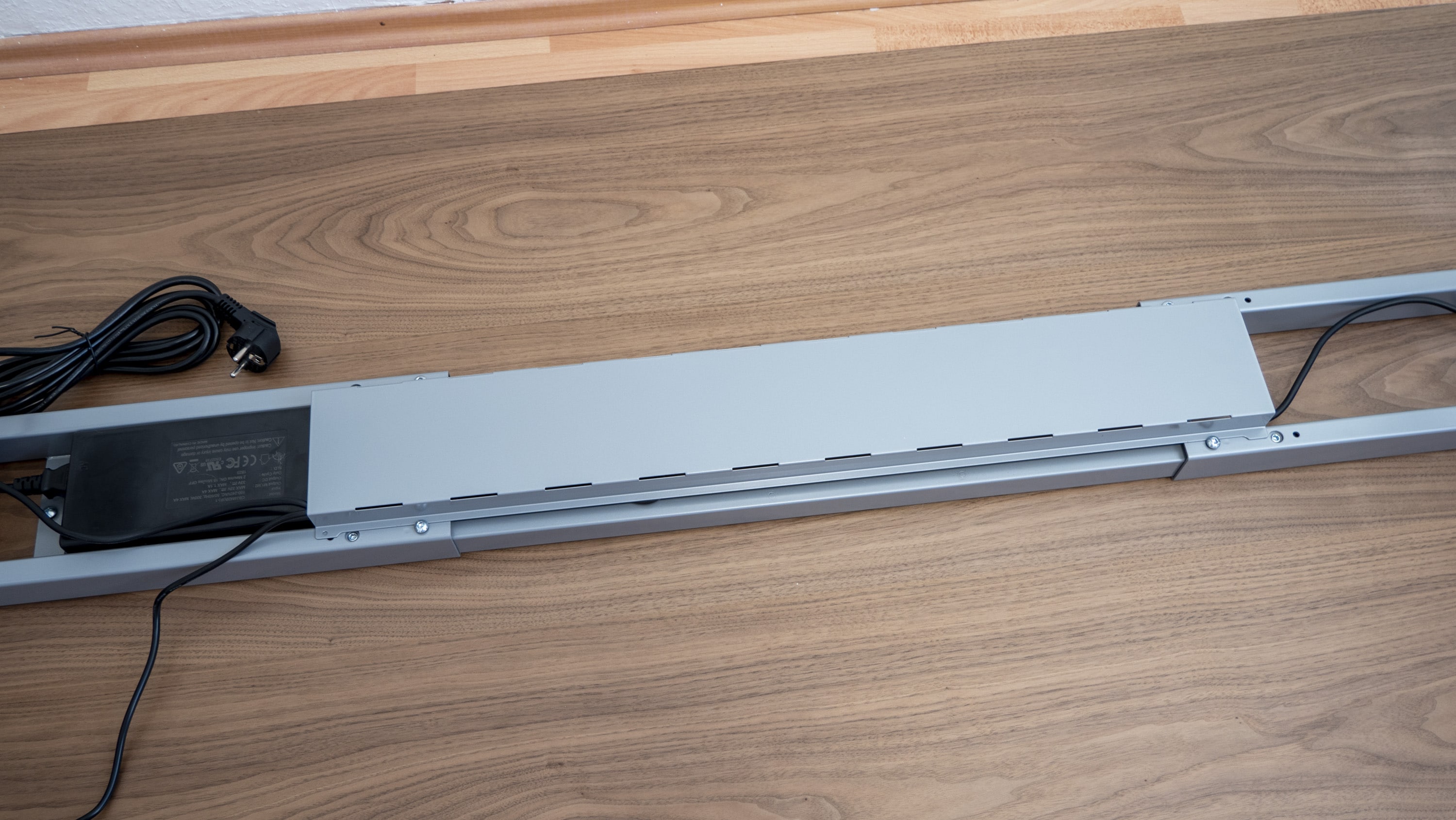 Bestellt werden kann der Schreibtisch mit oder ohne Tischplatte. Wir haben uns für unseren Test für ein Modell mit Tischplatte entschieden. Entsprechend fand sich in der Packung neben einem grauen Tischgestell und zwei Elektromotoren eine solche. Die Platte selbst – wir haben die Farbvariante Black Walnut bestellt – wirkt wie eine durchschnittliche, vergleichsweise günstige Tischplatte. Mit ihren Maßen von 180×80 cm bei 2,5 cm Dicke ist sie vergleichsweise groß, perfekt für einen ordentlichen Arbeitsplatz. Bei Bedarf kann die Tischplatte natürlich auch gegen eine kleinere oder größere ausgetauscht werden kann. Kompatibel sind Gestell und Motor mit Platten von bis zu 2,10 Meter Breite.