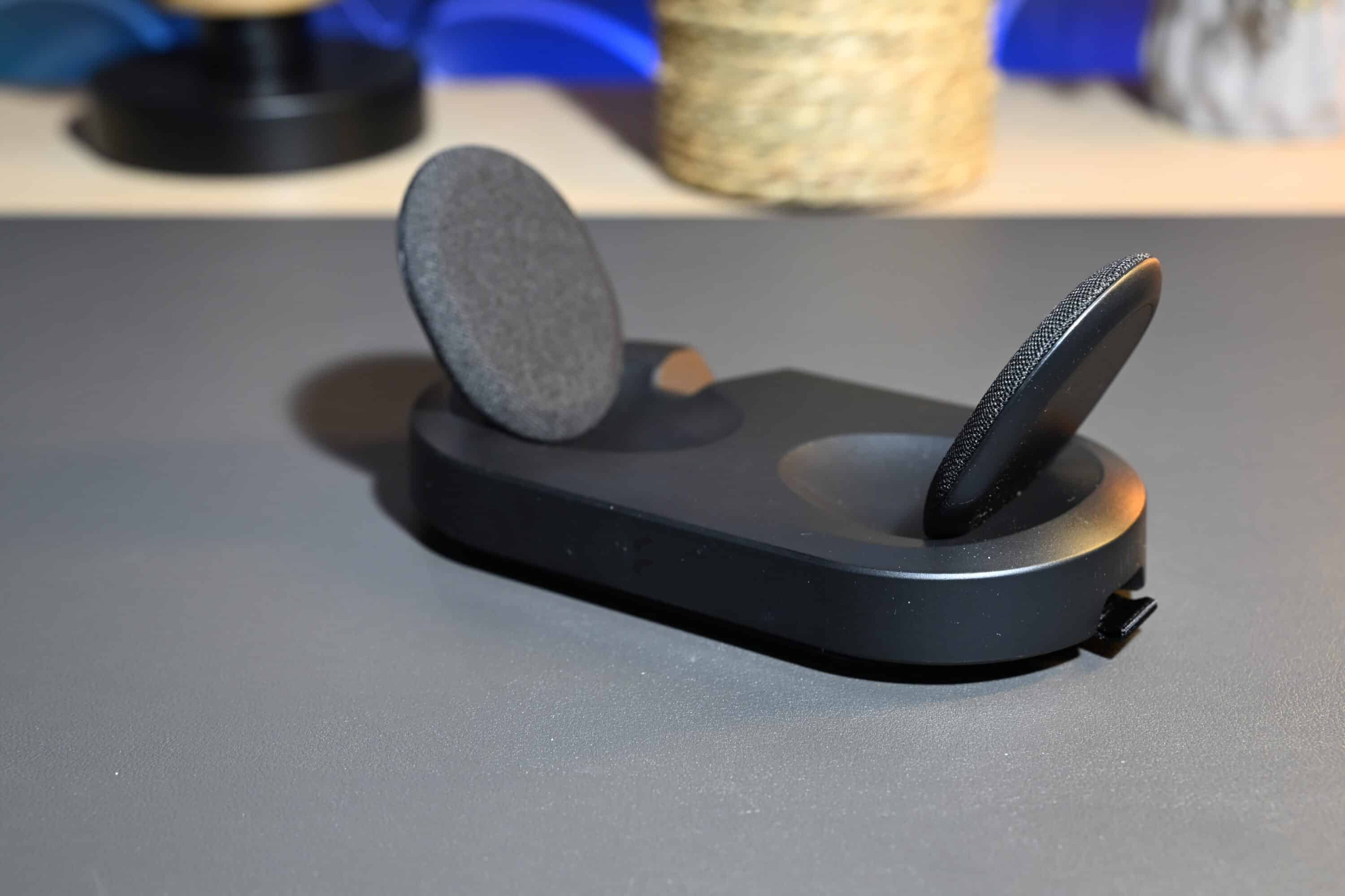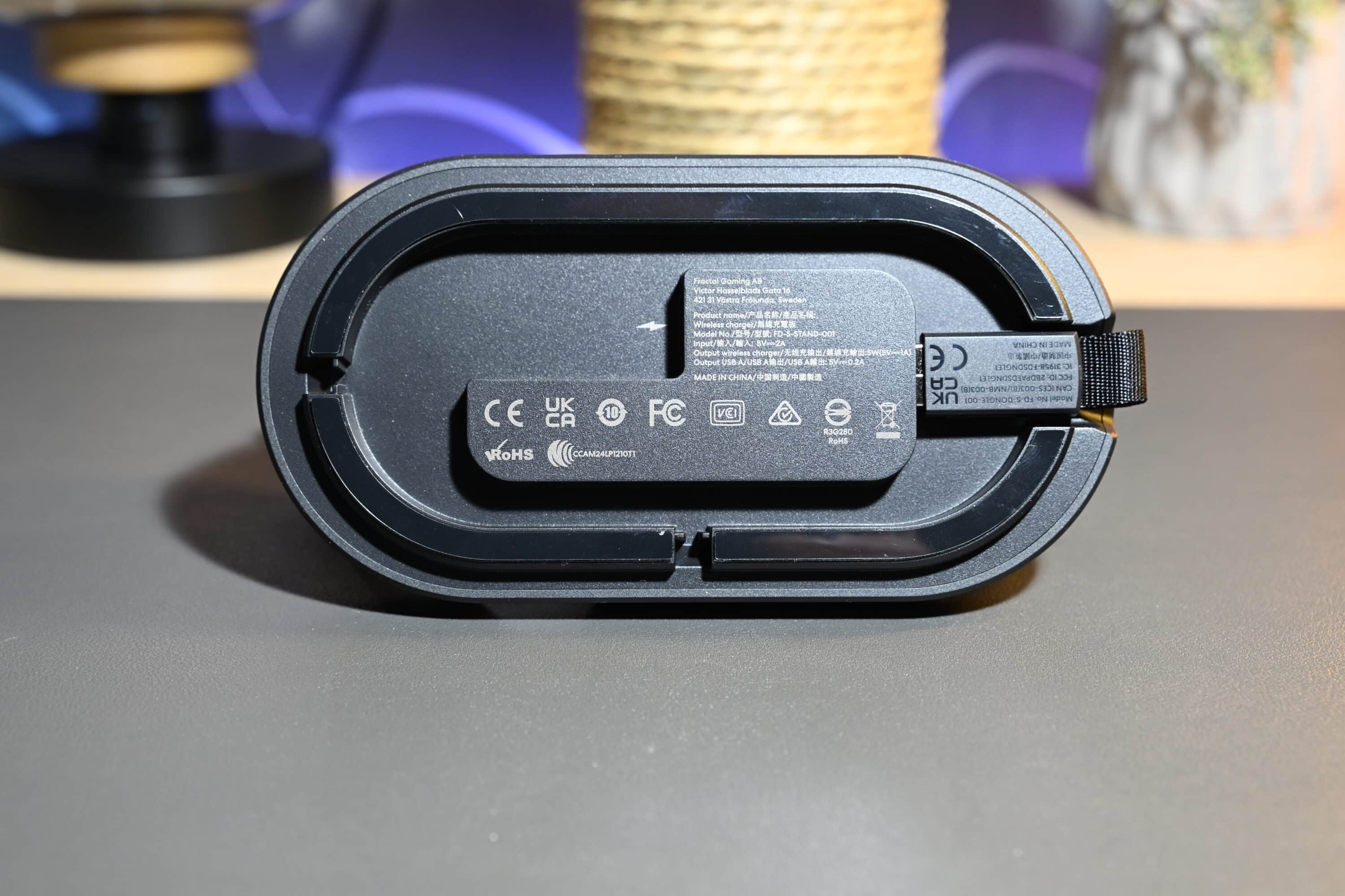 Eine Besonderheit des Fractal Design Scape markiert die im Lieferumfang enthaltene Basisstation, die gleich mehrere Zwecke erfüllt. Einerseits dient diese als Ständer für das Headset und sorgt dafür, dass der Kopfhörer nicht auf dem Tisch rumfliegt. Andererseits lädt diese das Scape kabellos auf.