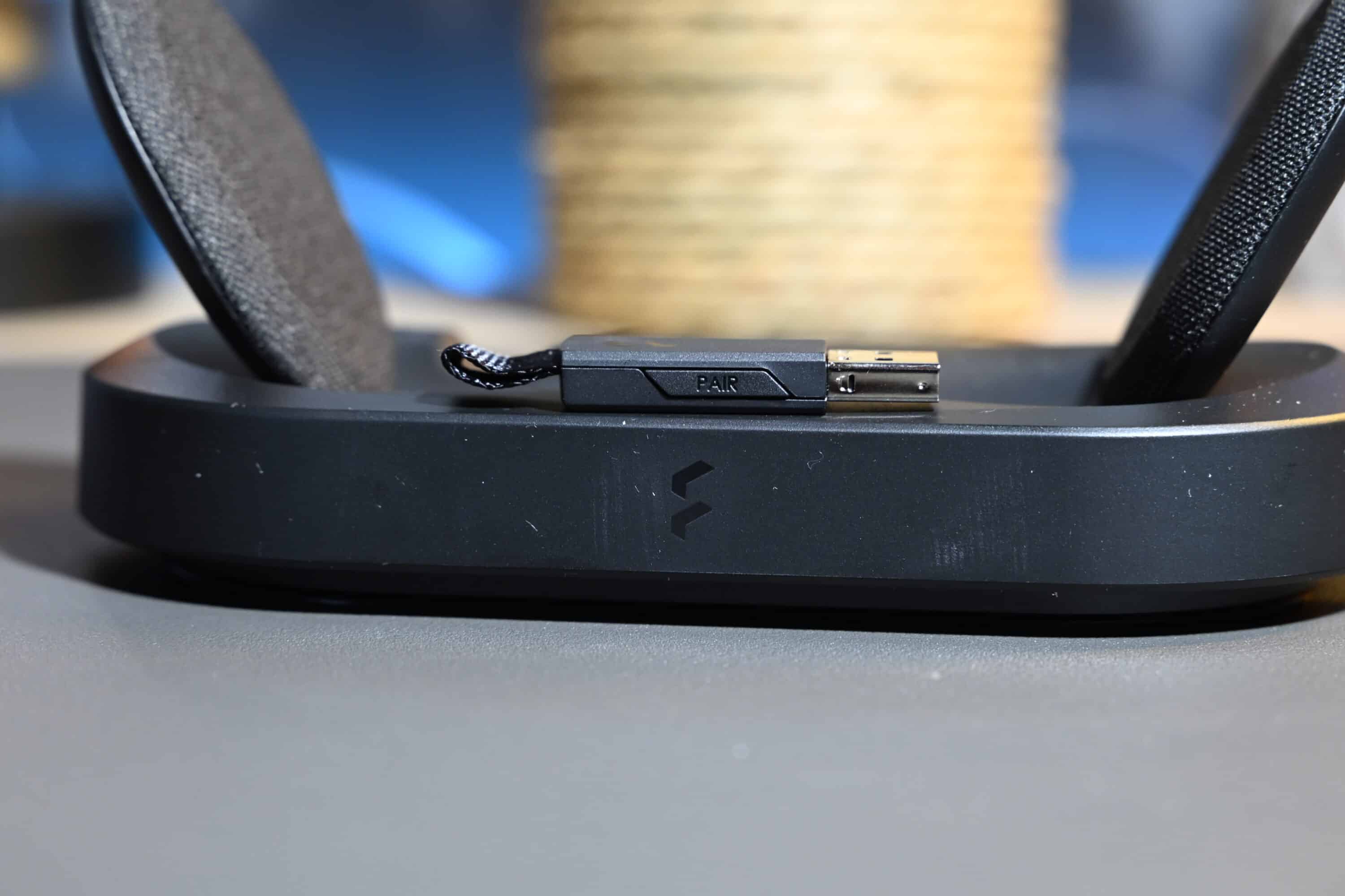 Dafür verfügt die kabellose Ladestation über einen USB-C-Port an der Unterseite, über die sie dann mit PC, Notebook oder Spielekonsole verbunden wird. Hier findet sich zudem der USB-A-Dongle, der praktischerweise in der Ladestation verbleiben kann, wenn du die Basis an dein System anschließt. Ein hervorragend durchdachtes Konzept, das ebenfalls sehr edel aussieht und tadellos funktioniert.