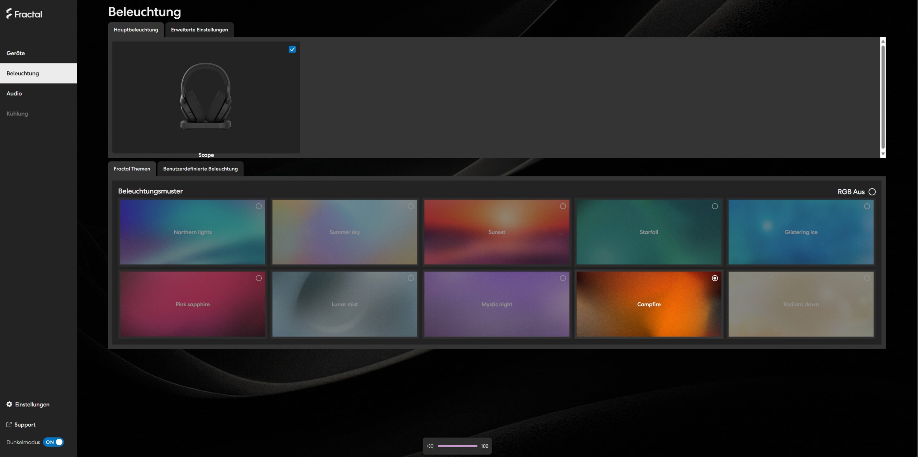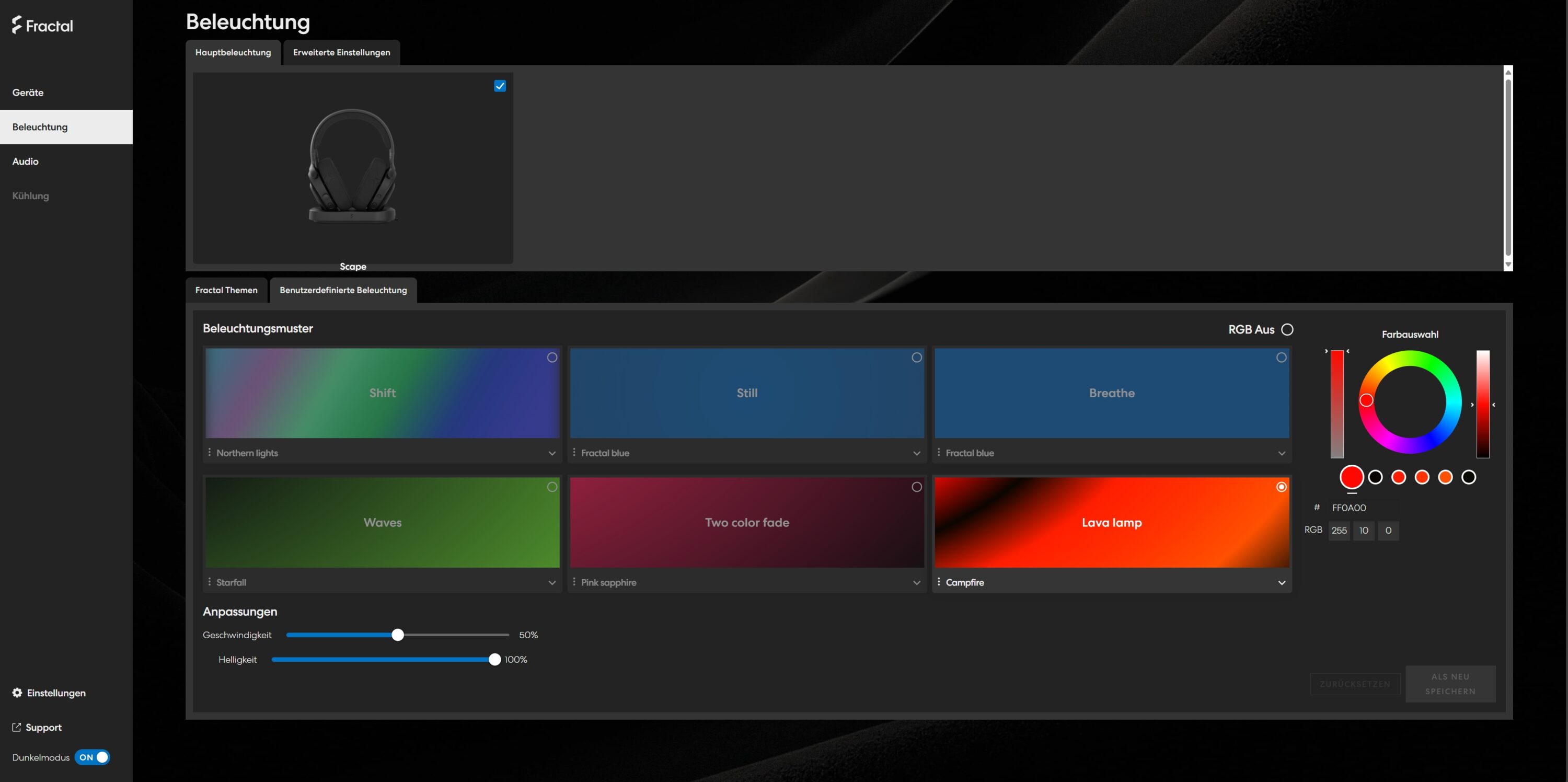 Die Hauptseite informiert über den Akkustand und die verbundenen Geräte. Im Bereich „Beleuchtung“ kannst du zwischen zehn vordefinierten Effekten wählen oder deine ganz eigenen Beleuchtungseffekte erstellen. Zudem unterstützt das Scape Windows Dynamische Beleuchtung (WDL), was eine Hersteller-übergreifende Synchronisation erlaubt.