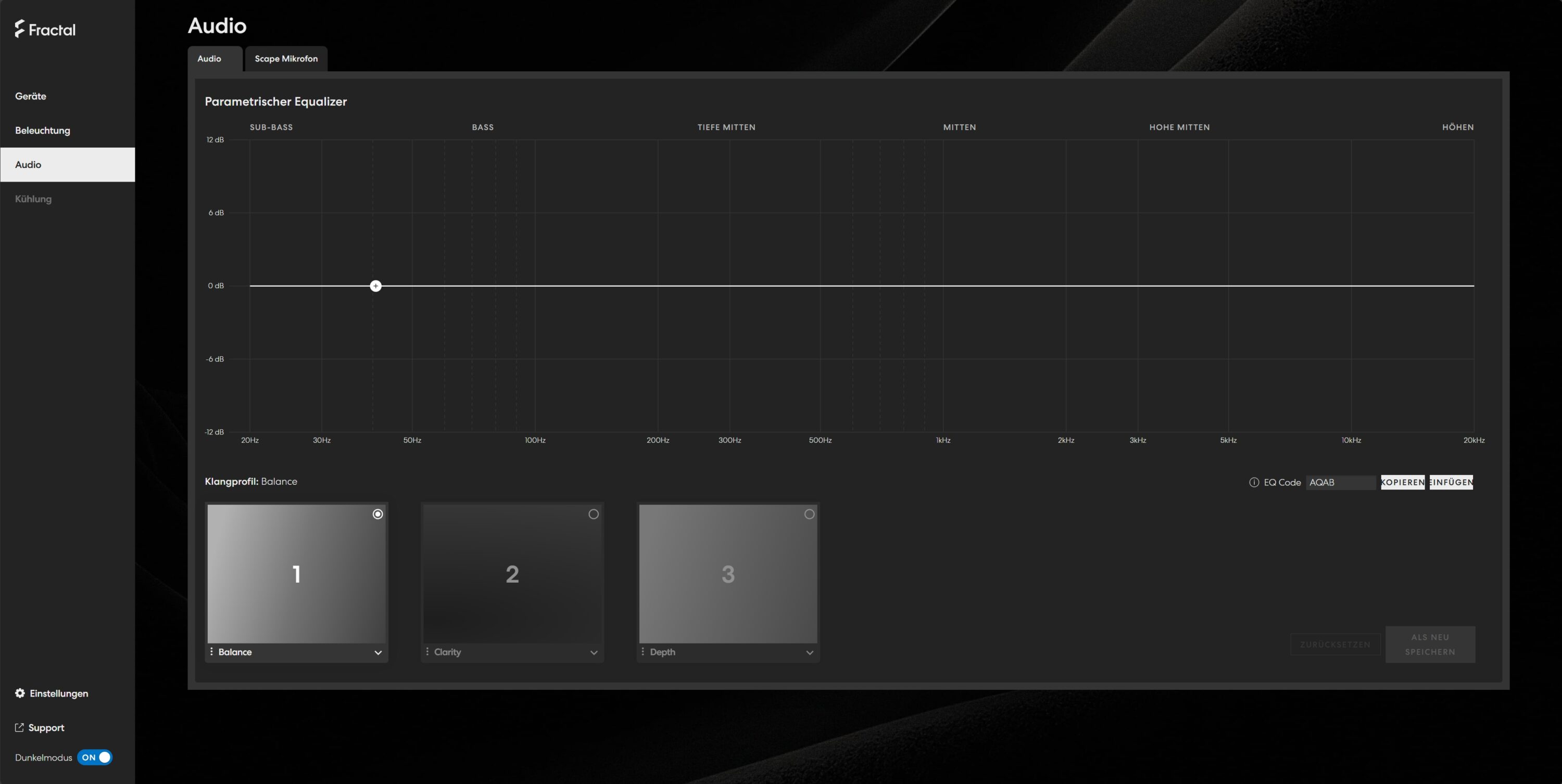 Für die Equalizer-Einstellungen erstellt das Web-Interface zudem EQ Codes, die sich ganz einfach teilen und importieren lassen, um Freunden deine Einstellungen durchzugeben. Außerdem passt du im Reiter „Scape Mikrofon“ das Mikro des Headsets an. Neben Sidetone kann hier jedoch lediglich eine Rauschunterdrückung hinzugeschaltet werden. Einen Equalizer für das Mikro gibt es nicht.
