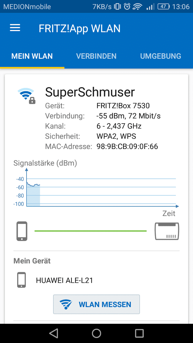 Mit der FRITZ!App WLAN können Details zur WLAN-Verbindung angezeigt werden. Die App gibt Informationen zur Geschwindigkeit und zeigt alle empfangenen WLANs sowie ihre Signalstärken an.
