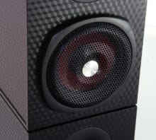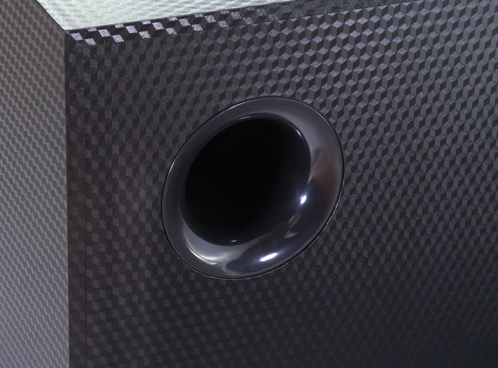 Auf Kontrastelemente wird bei den Lautsprechern weitestgehend verzichtet, die einzige optische Auflockerung bieten das Bedienpanel auf der rechten Seite, das Bassreflexrohr auf der linken Seite des Subwoofers und natürlich die Chassis. Ansonsten setzen die Lautsprecher vollständig auf glatte Flächen im besagten Carbon-Look.