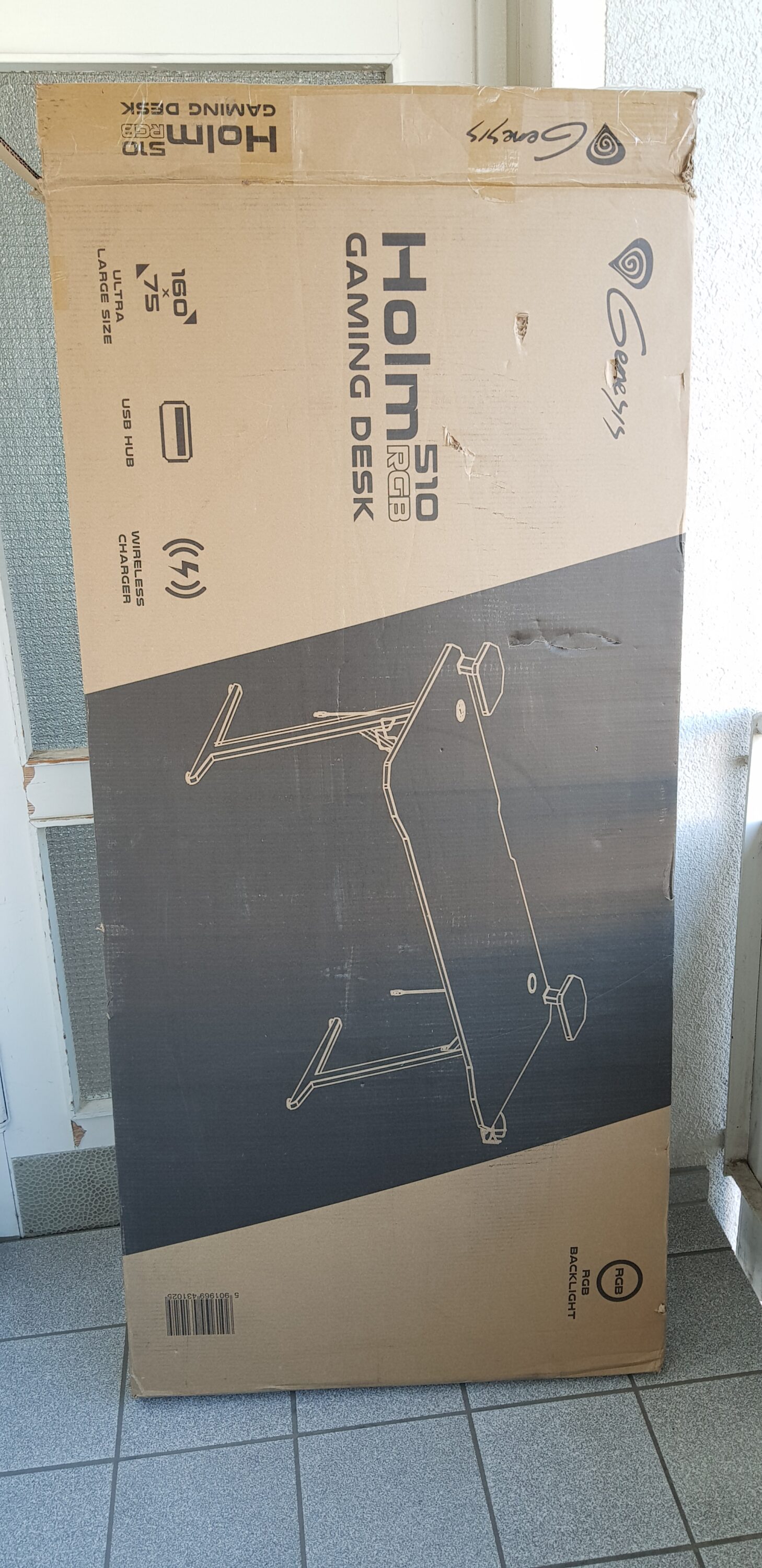 Das Paket, welches einen erreicht, ist doch relativ groß und unhandlich. Da die Tischplatte eine Länge von 160 cm bietet, ist das Paket noch ein gutes Stück länger und entsprechend schwer zu handhaben. Der Karton hinterlässt dabei einen gemischten Eindruck. Die aufgedruckten Features heben das Produkt klar von anderen ab, jedoch wirkt die naturbelassene Kartonage nicht besonders hochwertig. Die Verpackung ist funktional, entspricht aber nicht dem, was der verwöhnte Gamer, der seine Produkte in aufwändigen Hochglanzverpackungen geliefert bekommt, gewohnt ist. Dies ist durchaus schade, da das Produktvideo auf der Seite von Genesis durchaus hochwertig wirkt und die Erwartungshaltung dementsprechend hoch ist – die Verpackung versprüht dann aber leider eher Baumarktcharme.