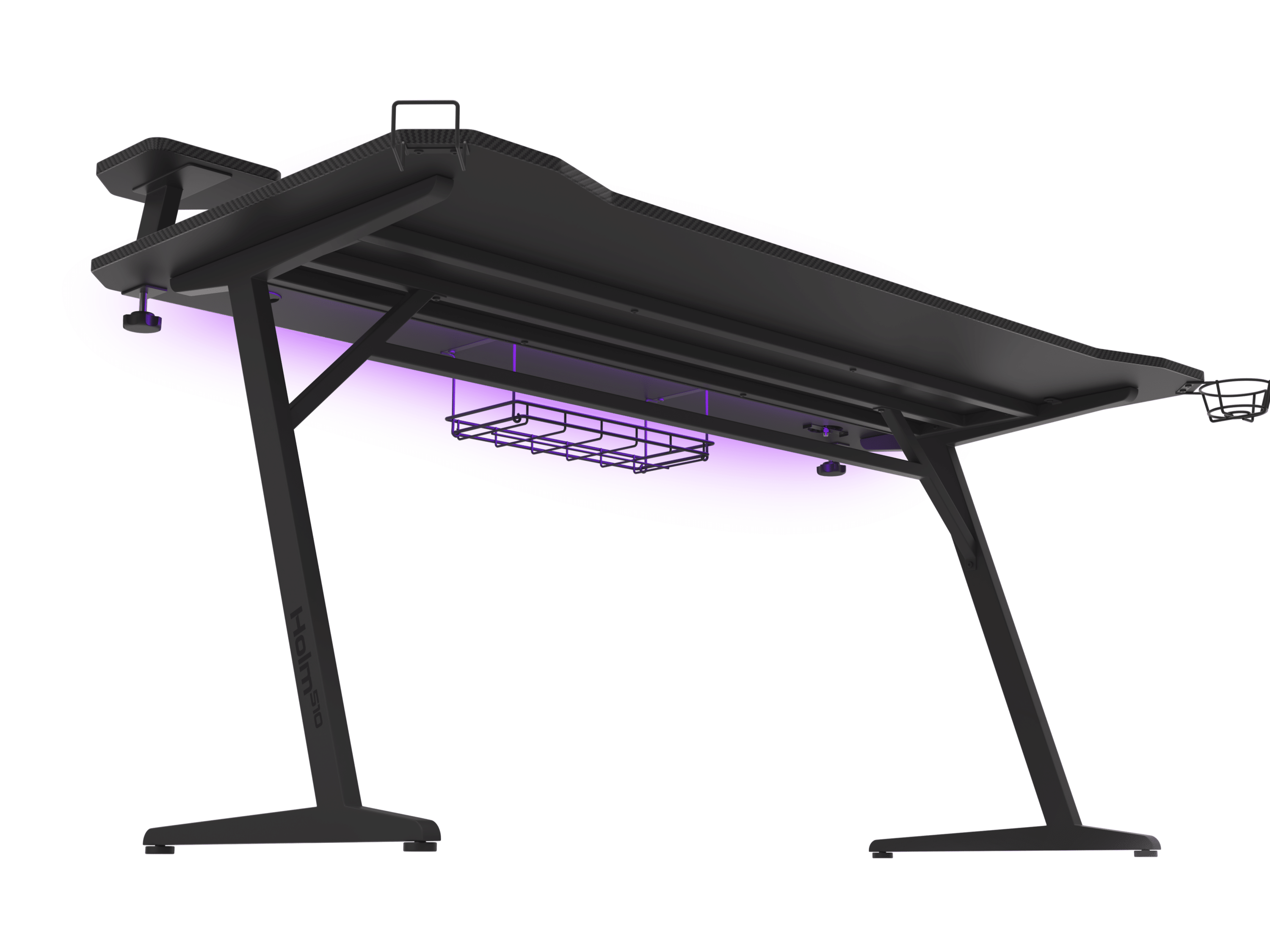 Das Design des Genesis Holm 510 RGB weiß auf den ersten Blick durchaus zu gefallen. Die folierte Karbonoberfläche gibt dem Tisch einen modernen Look und wirkt edel, mit einem Hauch von Sportlichkeit, der aus Fahrzeugen bekannt ist. Der Übergang von MDF-Platte zu Folierung fällt kaum bis gar nicht in Auge. Die Verarbeitung der Tischplatte ist grundsätzlich als gut zu beurteilen. Die Unterseite der Tischplatte wirkt etwas scharfkantiger – nicht so, dass man sich schneiden würde, aber eine leicht abgerundete Kante wäre für die Haptik schöner gewesen.