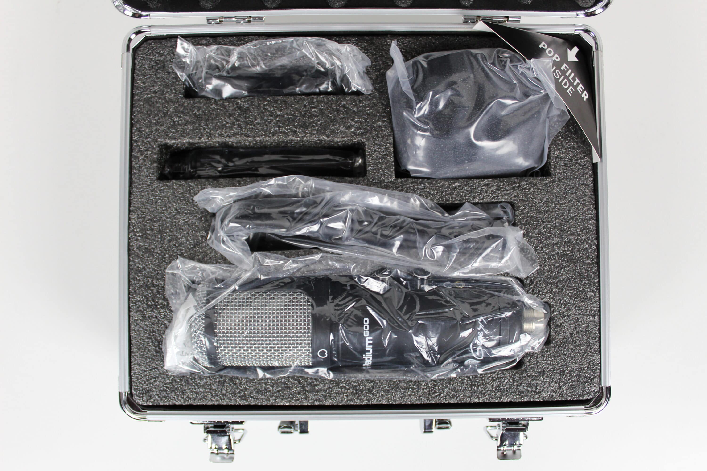 Das Mikrofon ist als Tischmikrofon gedacht und kommt somit mit einem massiven Standfuß, einem Windschutz und einem Popfilter. All das wird in einem Case geliefert, welches optisch stark an die Cases erinnert, in denen Tontechnik auf Veranstaltungen verstaut wird – wenn auch natürlich etwas dünner und weniger robust. Dennoch ist dies eine schöne Möglichkeit, das Mikrofon erneut zu verpacken und zu transportieren.