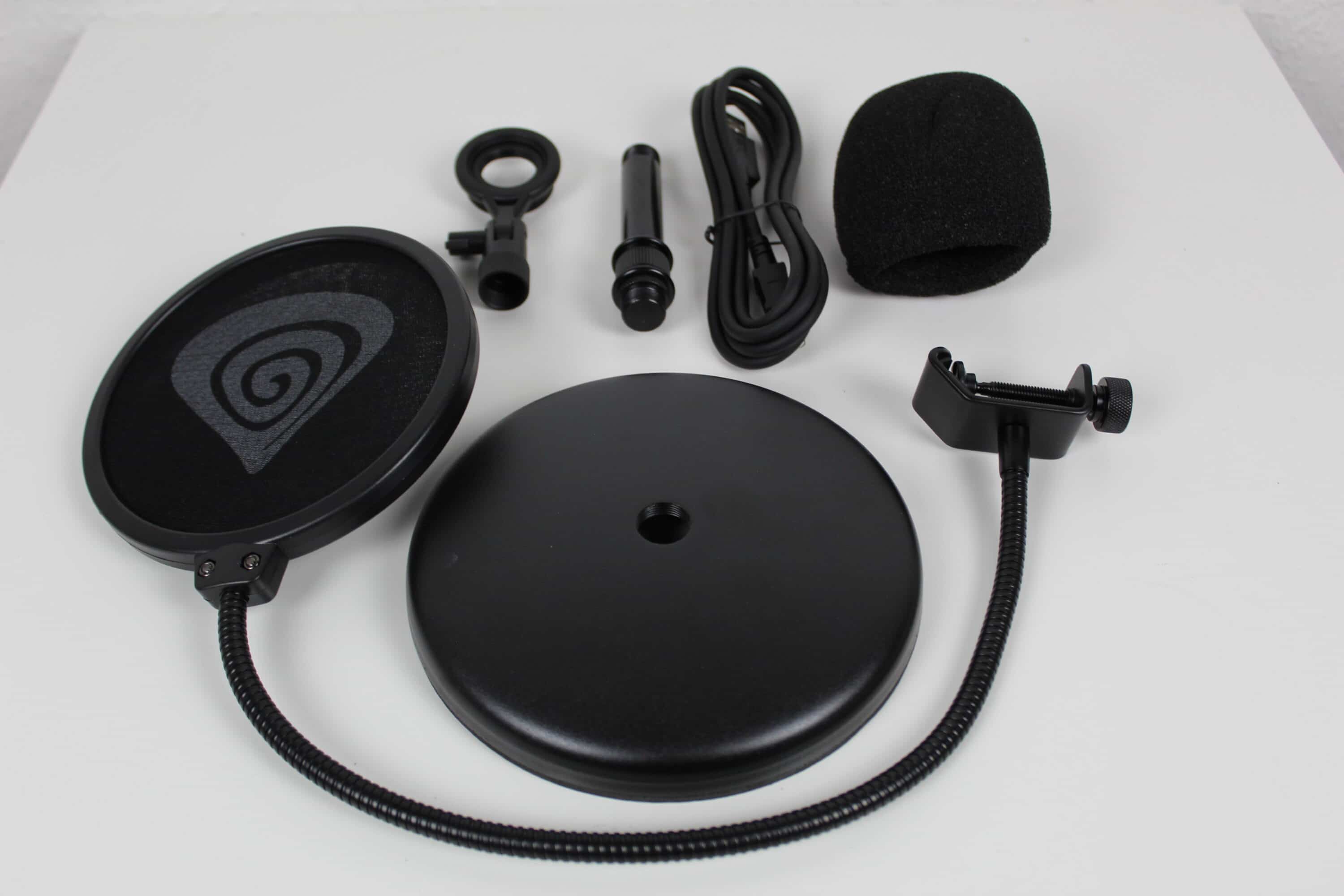 Der Standfuß ist schwer und steht so sicher und rutschfest auf dem Tisch. Der Aufbau ist recht simpel – das höhenverstellbare Zwischenstück wird einfach in den Fuß geschraubt, auf diesem wird anschließend das Mikrofon verschraubt. Der Popschutz lässt sich anschließend ebenfalls an diesem anschließen.