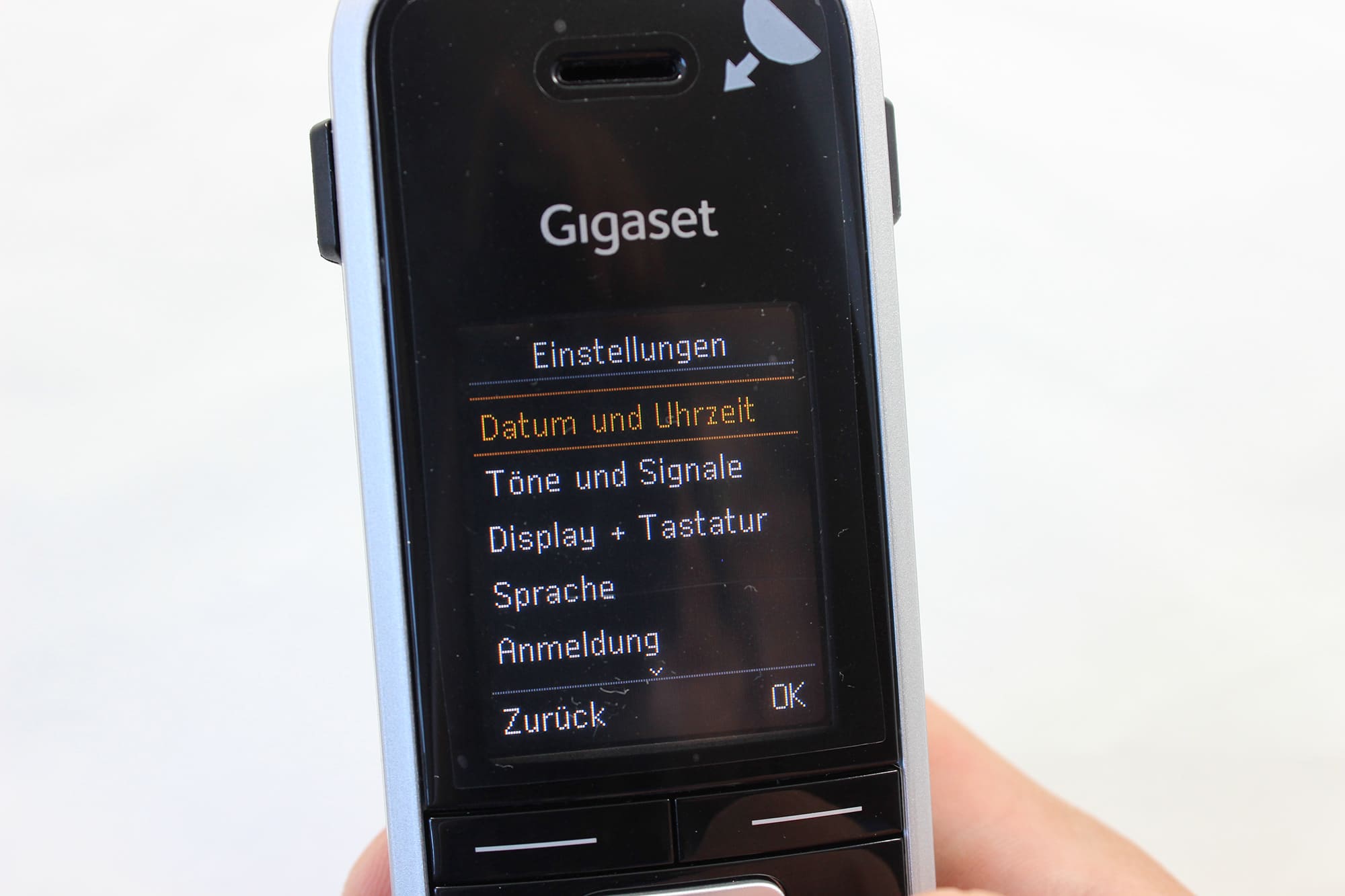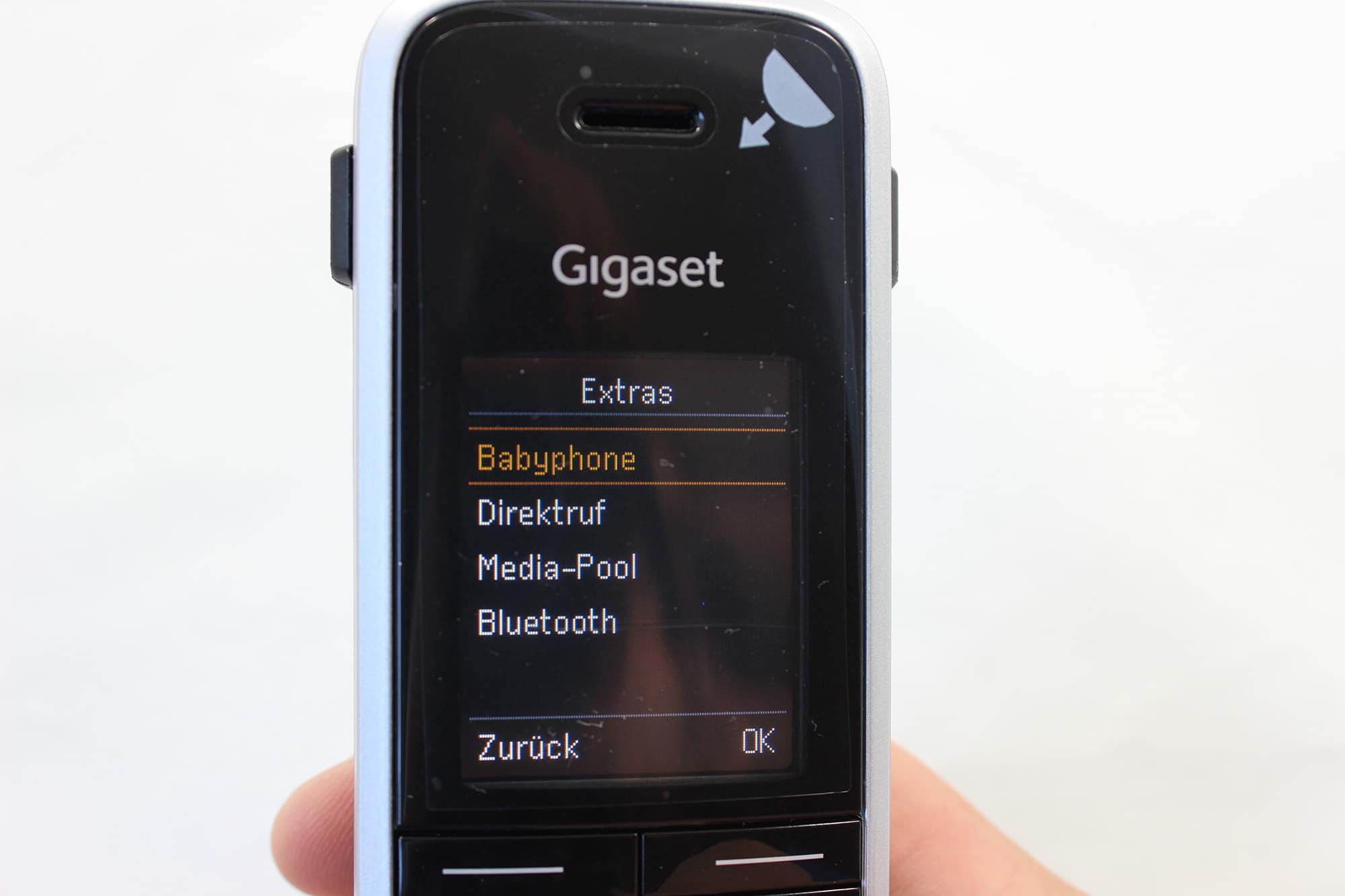 Neben dem DECT-Anschluss besitzt das Mobilteil zusätzlich Bluetooth, Micro-USB und einen 2,5 mm Headset-Anschluss. Über Bluetooth kann einfach ein kabelloses Headset verbunden werden um frei zu sprechen. Falls man noch auf die alte Kabelmethode setzt, gibt es aber auch den 2,5 mm Anschluss. Schade, dass dieser nicht 3,5 mm misst, denn so müssen sich die meisten dafür vermutlich extra Zubehör kaufen und können nicht auf ihren Smartphone-Kopfhörer setzen.