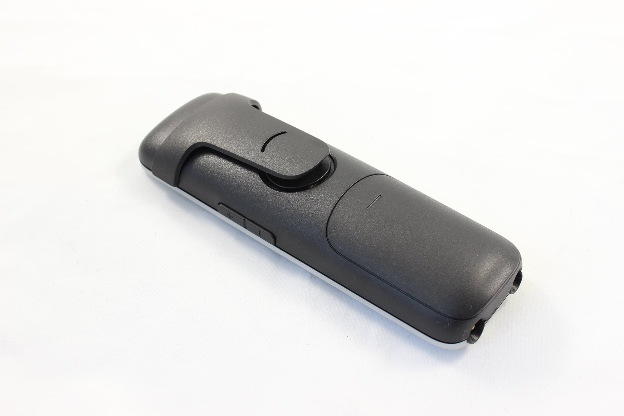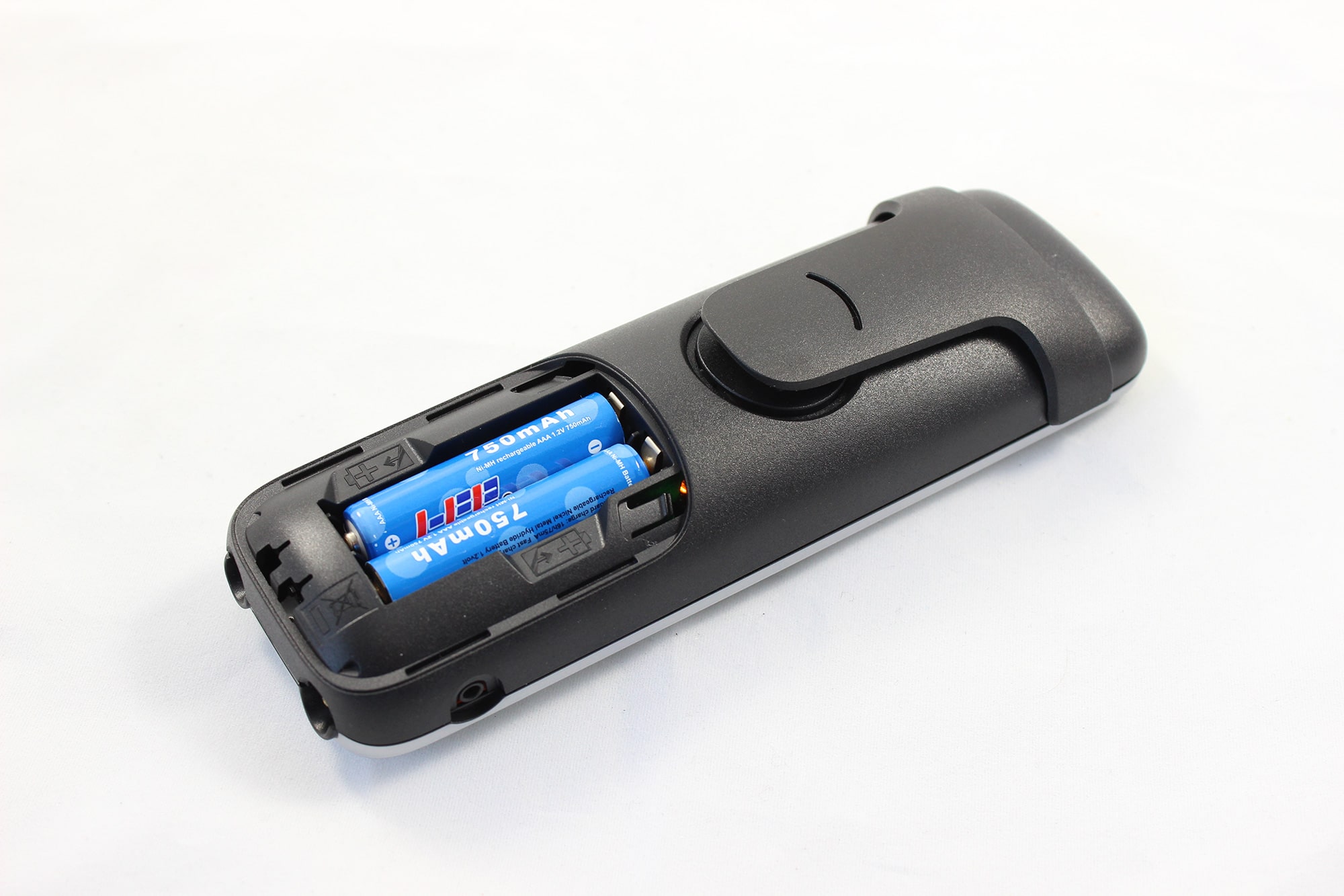 Insgesamt misst das Mobilteil 151 x 52 x 30 mm (H x B x T). Dabei hat es ein Gewicht von 135 g inklusive Akku. Das Telefon liegt mit seiner Größe gut in der Hand – die meisten anderen Telefone orientieren sich auch etwa an diesen Maßen. Mit 135 g ist das Telefon schön leicht – das meiste machen davon die Akkus aus. Ideal wäre da eventuell die Wahl zwischen 1 oder 2 Akku-Betrieb gewesen, denn ein Akku sollte den meisten von der Laufzeit her auch ausreichen und würde das Gewicht nochmal gut reduzieren. Betrieben wird das Mobilteil von zwei AAA-Batterien. Durch den Klipp auf der Rückseite kann man das Mobilteil einfach an Hose oder T-Shirt festklippen und hat die Hände frei. Die Tastatur des Mobilteils ist natürlich beleuchtet.