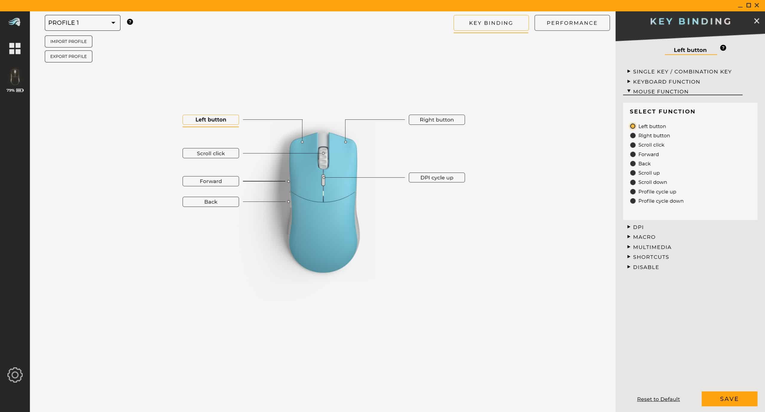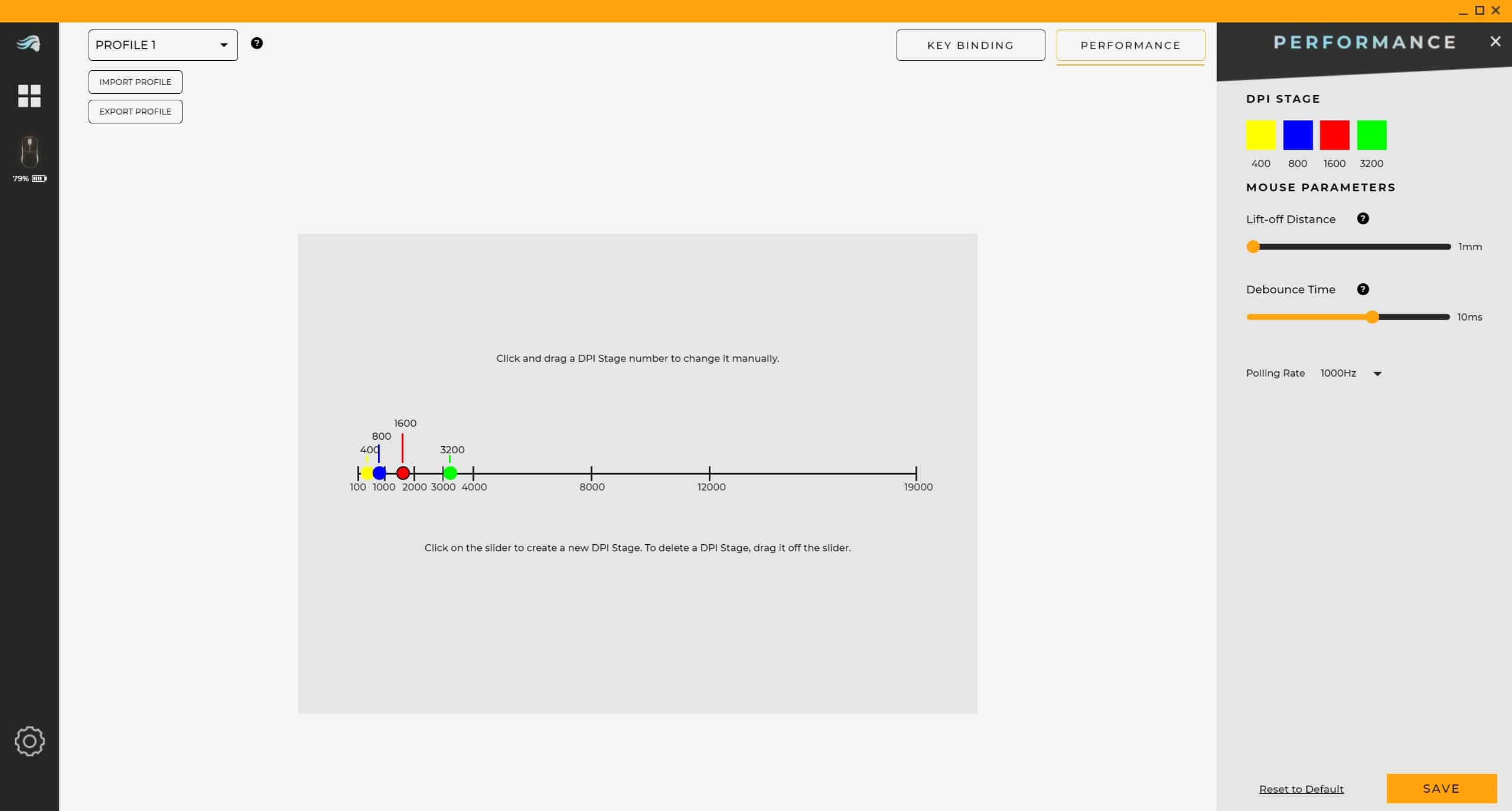 Im Menü „Performance“ hingegen legst du die vier auf der Maus gespeicherten DPI-Stufen samt dazugehöriger Farbe (dargestellt durch die LED an der Unterseite der Maus) fest. Hier ist, ab Werk, der Maximalwert auf 3.200 DPI eingestellt, womit die Model O Pro Wireless nur einen Bruchteil ihres Potentials abruft.