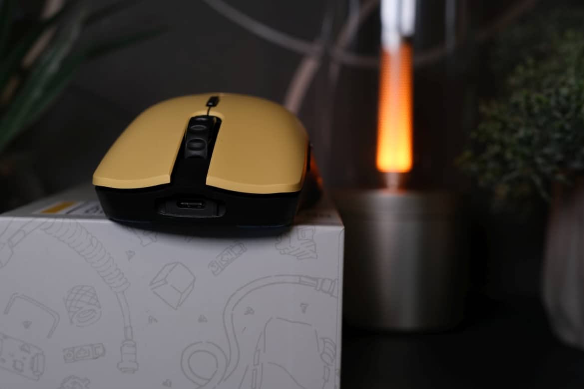 Zwischen den beiden Primär-Tasten, die auf besonders langlebige mechanische Switches mit einer Lebensdauer von 80 Millionen Klicks setzen, findest du ein angenehm geriffeltes Mausrad. Darunter sitzen eine längliche Taste, mit der du die DPI-Auflösung einstellen kannst, sowie eine LED-Anzeige, die über den Akkustand des Nagers informiert.