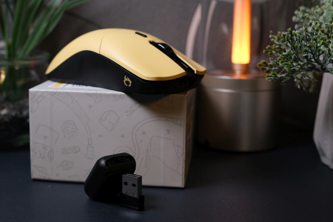 Kabellos findet die Glorious Model O Pro Wireless mithilfe des beiliegenden USB-A-Dongles Verbindung zu PC, Laptop oder Mac und wird nach dem Einstecken des Receivers auch sofort erkannt. Jetzt nur noch an der Unterseite einschalten und schon kann es losgehen.