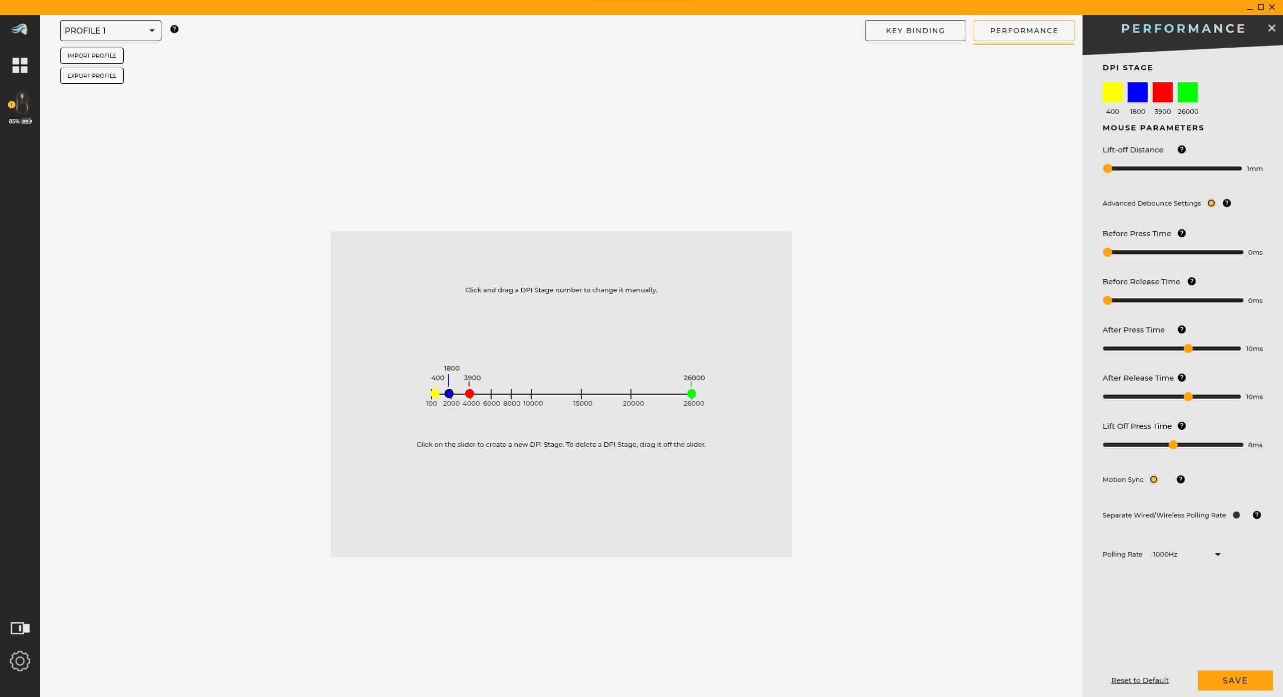 Im Reiter „Performance“ hingegen lässt sich die Glorious Model O2 Pro bis ins kleinste Detail feintunen. Einerseits können hier die vier farblich definierten DPI-Einstellungen frei angepasst werden (in 200-DPI-Schritten).