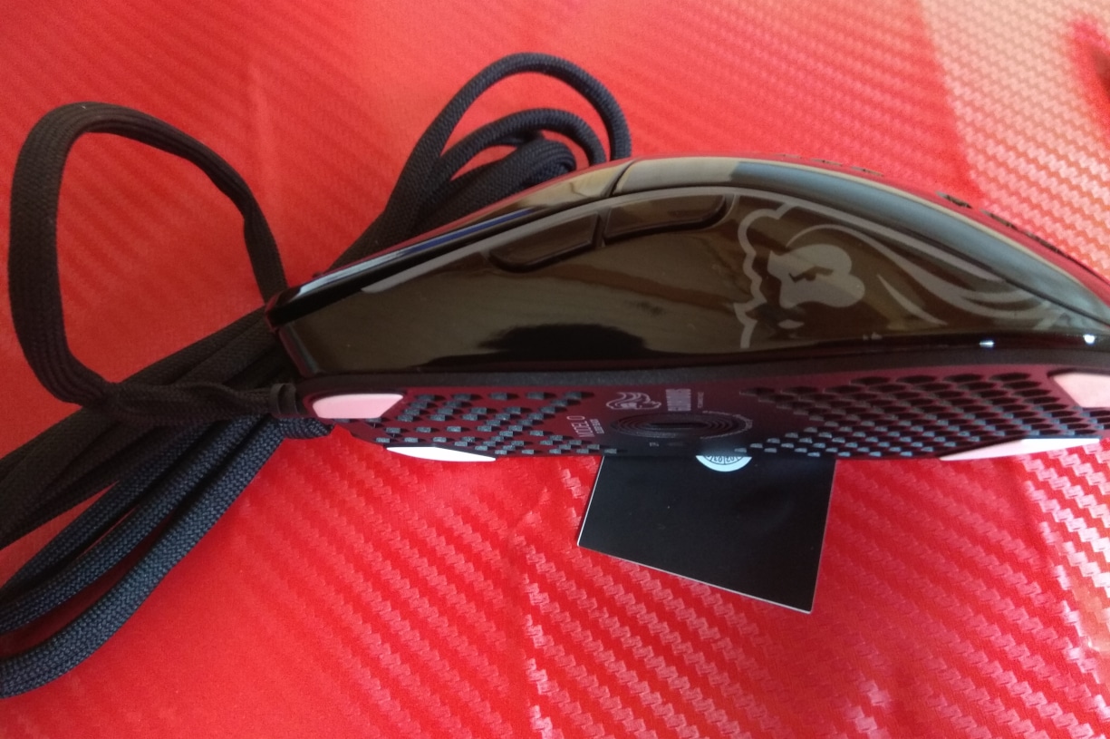 Die gesamte Maus wurde mit einer Art Klavierlack überzogen. Dies erhöht das Gewicht um ein Gramm im Vergleich zur matten Variante. Leider zieht der Lack Fingerabdrücke magisch an. Die Hand des Users kann durch die etwas glatte Oberfläche unter Umständen etwas rutschen.