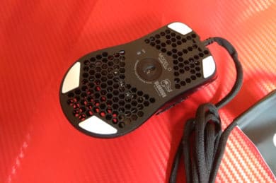 Das wohl auffälligste Element der Maus ist der Rücken der Oberseite. In diesen wurde ein Honigwaben-Muster eingearbeitet. Das sieht nicht nur schick aus, sondern senkt vor allem das Gewicht. Ein netter Nebeneffekt ist die passive Belüftung der Handinnenfläche. Dadurch schwitzt die Hand weniger.