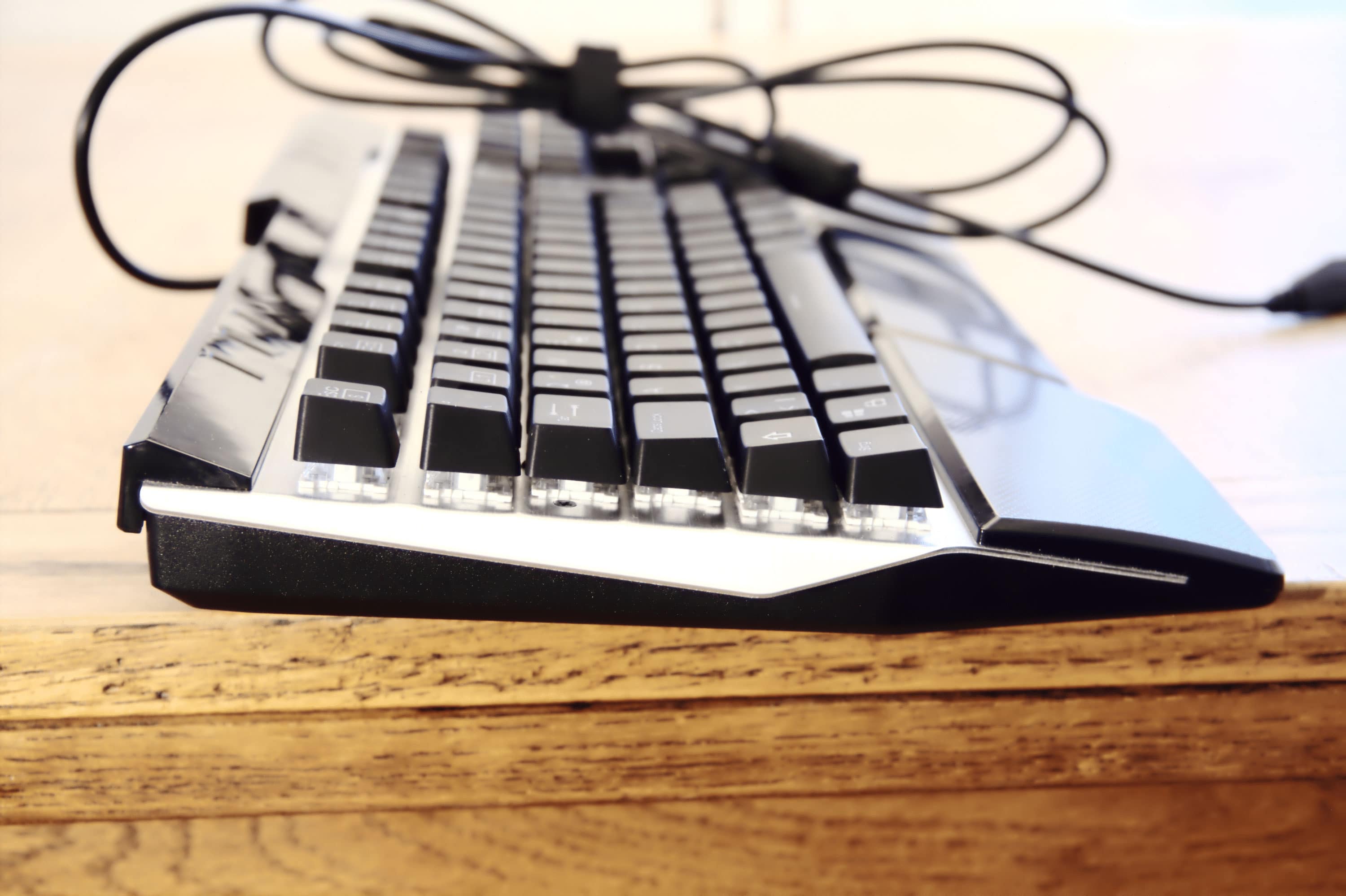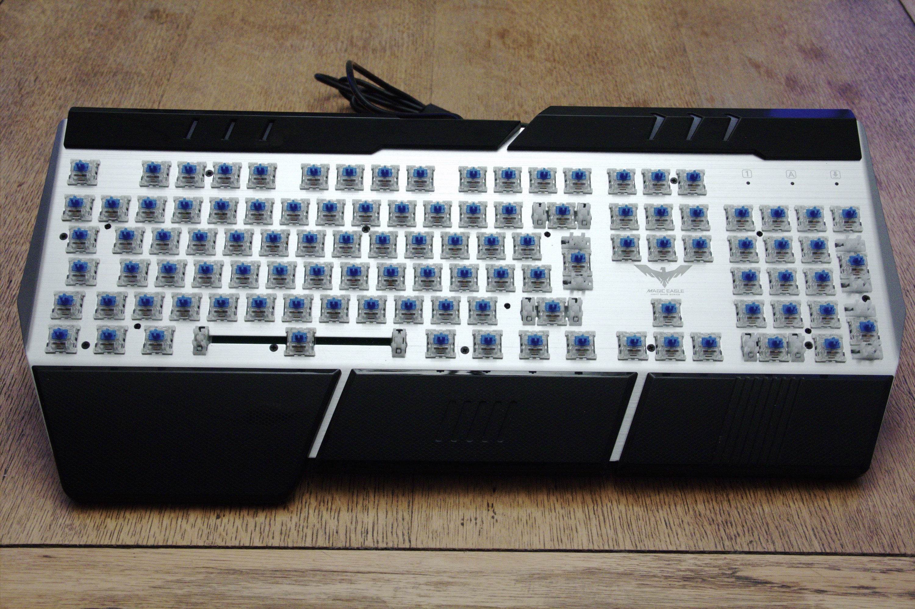 Bei den Tasten handelt sich um das herkömmliche 104-Layout. Die Multimediatasten sind in die F-Tastenreihe integriert, die per FN-Taste aktiviert werden können. Die Tastenoberflächen sind konkav, was sicheres blindes Tippen erleichtert. Ein erstes Tippen offenbart nur minimale subjektive Unterschiede zu den Blue-Switches von Cherry. Die Outemu-Switches sind etwas lauter und haben einen minimal höheren Druckpunkt. Zudem fällt auf, dass der Klicklaut nicht bei allen Tasten gleich ist, auf unserem Testmuster war der Klick auf der M-Taste durchgängig deutlich dumpfer als auf den anderen Tasten.